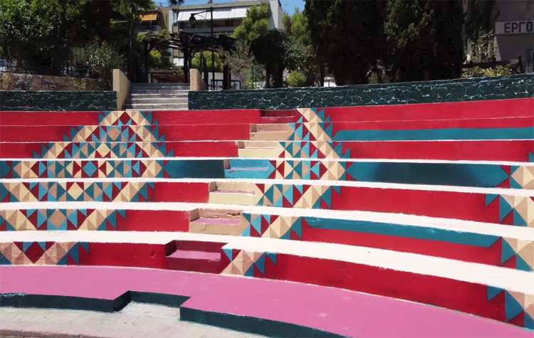 Η δημιουργία του street artist Achilles δανείζεται γεωμετρικά μοτίβα και χρώματα από τα παραδοσιακά χαλιά και κιλίμια που παρήγαγε κάποτε το ιστορικό προσφυγικό εργοστάσιο ταπητουργίας, το οποίο, ως διατηρητέο κτίριο, εξακολουθεί να στέκεται επιβλητικό πάνω από την κεντρική πλατεία.