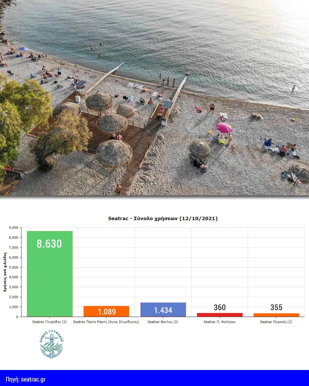 Νέο πανελλαδικό ρεκόρ σημείωσαν κατά τη φετινή καλοκαιρινή περίοδο τα δύο Seatrac που ήταν τοποθετημένα στη Β΄ παραλία Γλυφάδας. Έφθασαν τον αριθμό των 8.630 χρήσεων, ξεπερνώντας κατά 33% την αντίστοιχη περσινή δραστηριότητα, που ήταν και πάλι πρώτη πανελλαδικά ! Οι κολυμβητές με ειδικές ανάγκες βρίσκουν στη Γλυφάδα τις καλύτερες συνθήκες για να απολαύσουν τα θαλάσσια μπάνια τους.