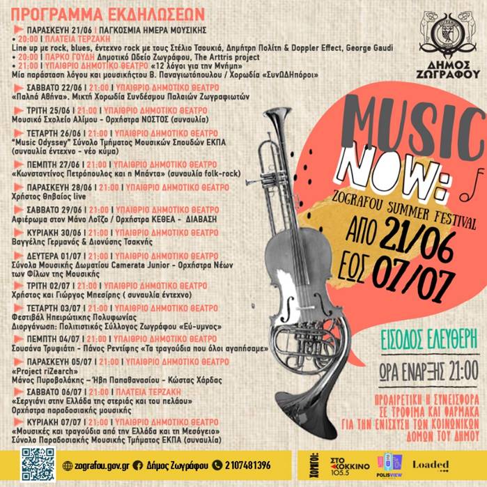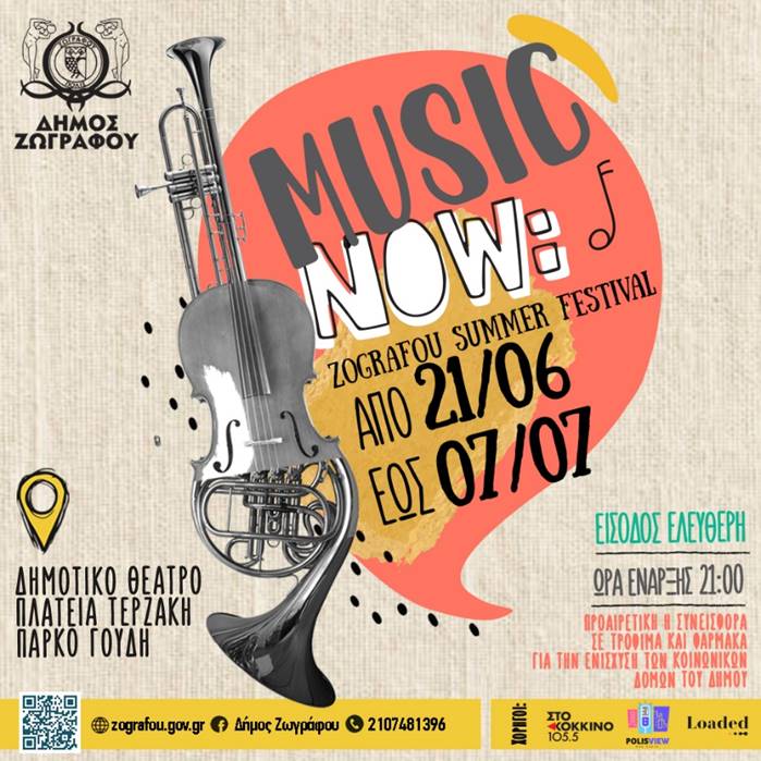 Το επιτυχημένο καλοκαιρινό φεστιβάλ μουσικής “Music Now! Ζωγράφου Summer Festival” συνεχίζει και φέτος ο Δήμος Ζωγράφου. Το φεστιβάλ ξεκινάει στις 21 Ιουνίου, τιμώντας την Ευρωπαϊκή Ημέρα Μουσικής και θα διαρκέσει μέχρι και την Κυριακή 7 Ιουλίου.