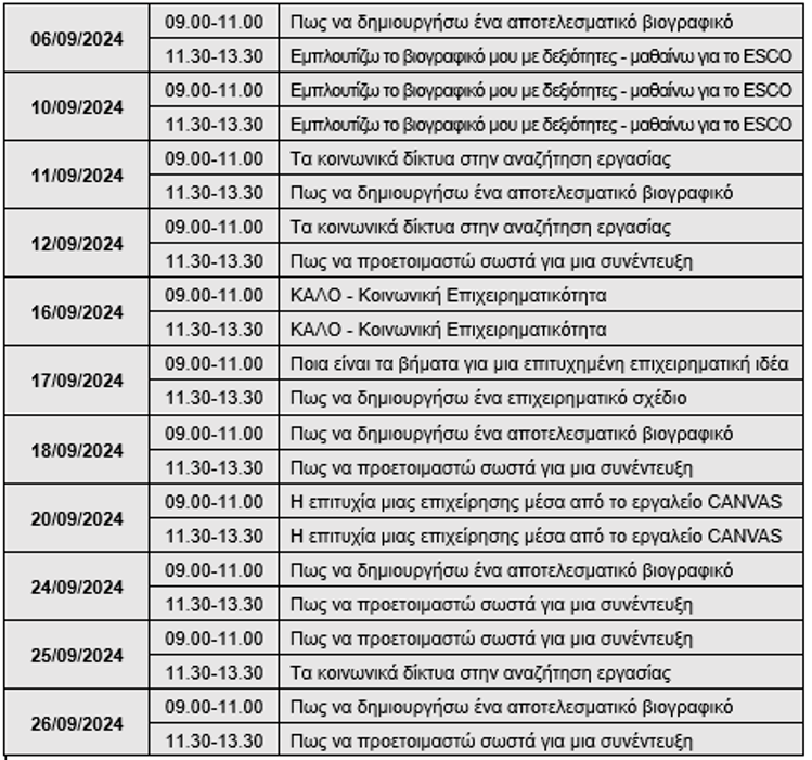 Τα 22 διαδικτυακά e-Εργαστήρια διάρκειας 2 ωρών θα πραγματοποιηθούν από εργασιακούς συμβούλους στις ημερομηνίες του παρακάτω πίνακα.