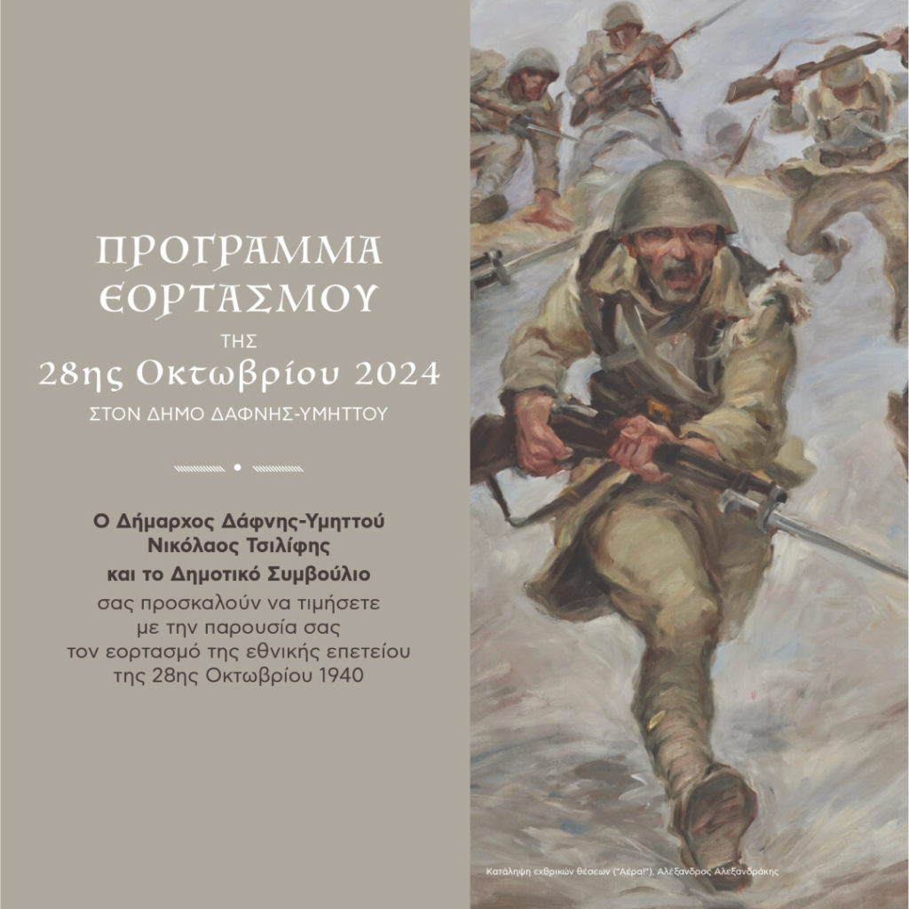 Ο Δήμαρχος Δάφνης- Υμηττού, Νικόλαος Τσίλίφης και το Δημοτικό Συμβούλιο με πρόσκληση τους καλούν όλους τους Δημότες να τιμήσουν με την παρουσία τους τον εορτασμό και τις εκδηλώσεις για την εθνική επέτειο της 28ης Οκτωβρίου 1940.