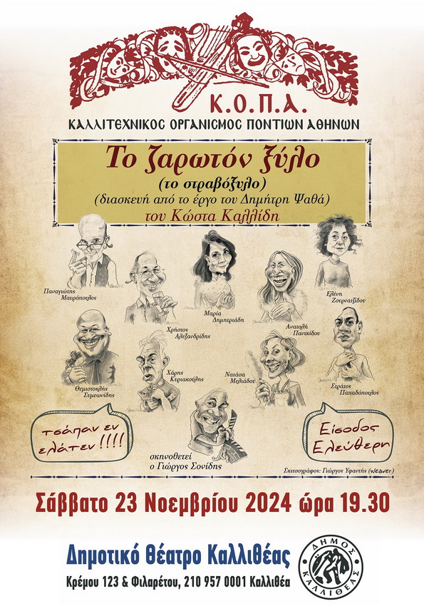 – «Το ζαρωτόν ξύλο» (το στραβόξυλο), του Κώστα Καλλίδη, σε σκηνοθεσία του Γιώργου Σονίδη, από τον Καλλιτεχνικό Οργανισμό Ποντίων Αθηνών, θα λάβει χώρο το Σάββατο 23 Νοεμβρίου και ώρα 19:30.