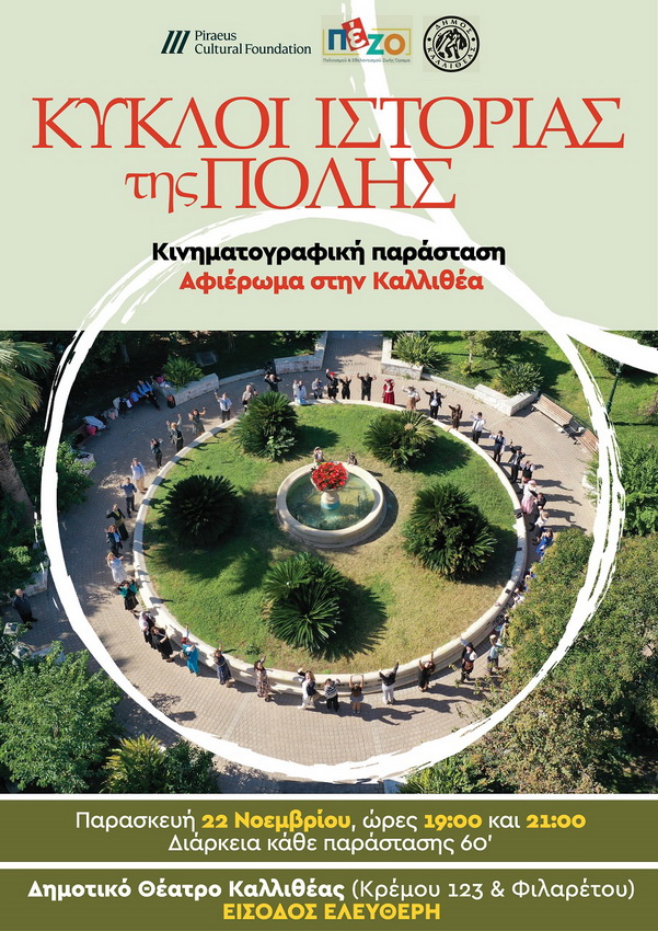 – Οι «Κύκλοι ιστορίας της πόλης» είναι μια κινηματογραφική παράσταση και αφιέρωμα στην Καλλιθέα από τον Σύλλογο ΠέΖΟ, την Παρασκευή 22 Νοεμβρίου και ώρα 19:00 με 21:00. Κάθε παράσταση έχει διάρκεια 60′.