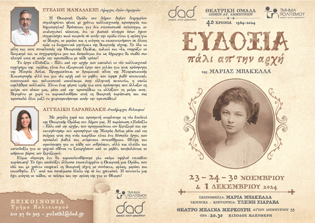 Η Θεατρική ομάδα του Δήμου Αγίου Δημητρίου γιορτάζει φέτος 40 χρόνια δημιουργίας με την παράσταση “Ευδοξία – Πάλι από την αρχή”, που θα παρουσιαστεί τα Σαββατοκύριακα: 23 & 24 Νοεμβρίου ΚΑΙ 30 Νοεμβρίου – 1 Δεκεμβρίου, στις 20:30, στο Θέατρο Μελίνα Μερκούρη (στο ισόγειο του Δημαρχείου Αγίου Δημητρίου), σε σκηνοθεσία- διδασκαλία και μουσική επιμέλεια της Μαρίας Μπακέλλα.