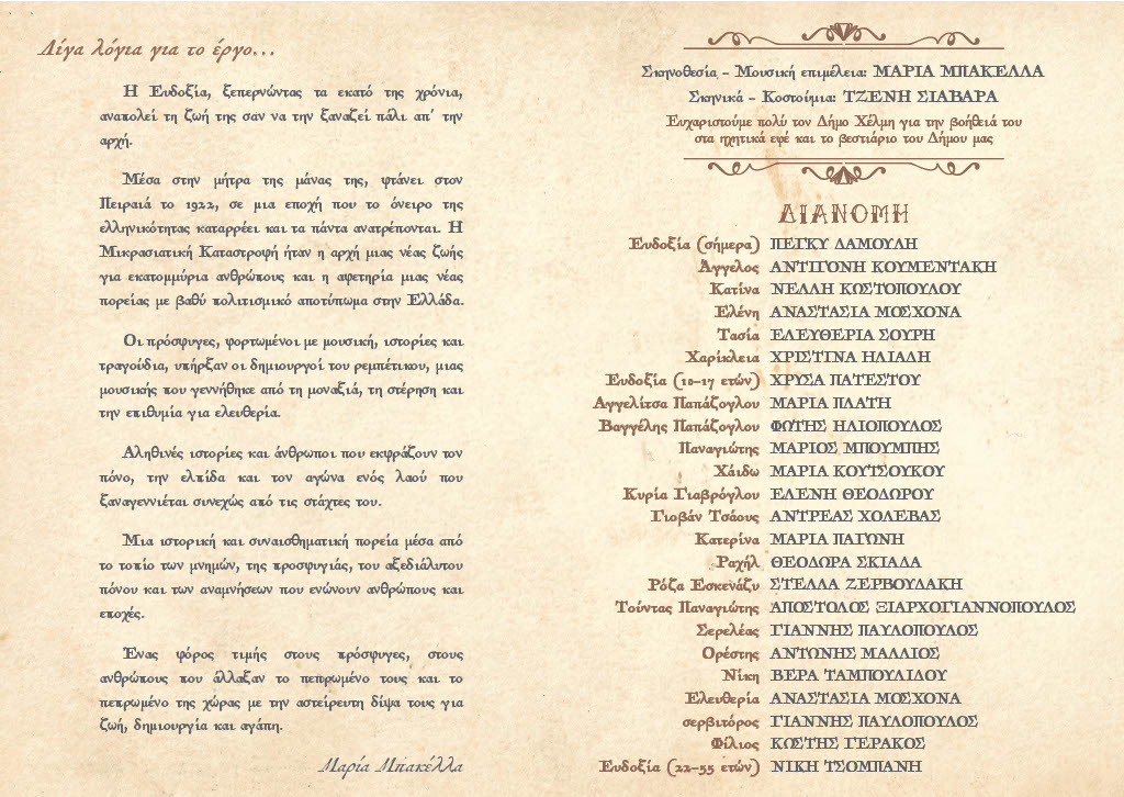 Η Ευδοξία, ξεπερνώντας τα εκατό της χρόνια, αναπολεί τη ζωή της σαν να την ξαναζεί πάλι απ΄ την αρχή. Μέσα στην μήτρα της μάνας της, φτάνει στον Πειραιά το 1922, σε μια εποχή που το όνειρο της ελληνικότητας καταρρέει και τα πάντα ανατρέπονται. Η Μικρασιατική Καταστροφή ήταν η αρχή μιας νέας ζωής για εκατομμύρια ανθρώπους και η αφετηρία μιας νέας πορείας με βαθύ πολιτισμικό αποτύπωμα στην Ελλάδα. Οι πρόσφυγες, φορτωμένοι με μουσική, ιστορίες και τραγούδια, υπήρξαν οι δημιουργοί του ρεμπέτικου, μιας μουσικής που γεννήθηκε από τη μοναξιά, τη στέρηση και την επιθυμία για ελευθερία. Αληθινές ιστορίες και άνθρωποι που εκφράζουν τον πόνο, την ελπίδα και τον αγώνα ενός λαού που ξαναγεννιέται συνεχώς από τις στάχτες του. Μια ιστορική και συναισθηματική πορεία μέσα από το τοπίο των μνημών, της προσφυγιάς, του αξεδιάλυτου πόνου και των αναμνήσεων που ενώνουν ανθρώπους και εποχές. Ένας φόρος τιμής στους πρόσφυγες, στους ανθρώπους που άλλαξαν το πεπρωμένο τους και το πεπρωμένο της χώρας με την αστείρευτη δίψα τους για ζωή, δημιουργία και αγάπη.