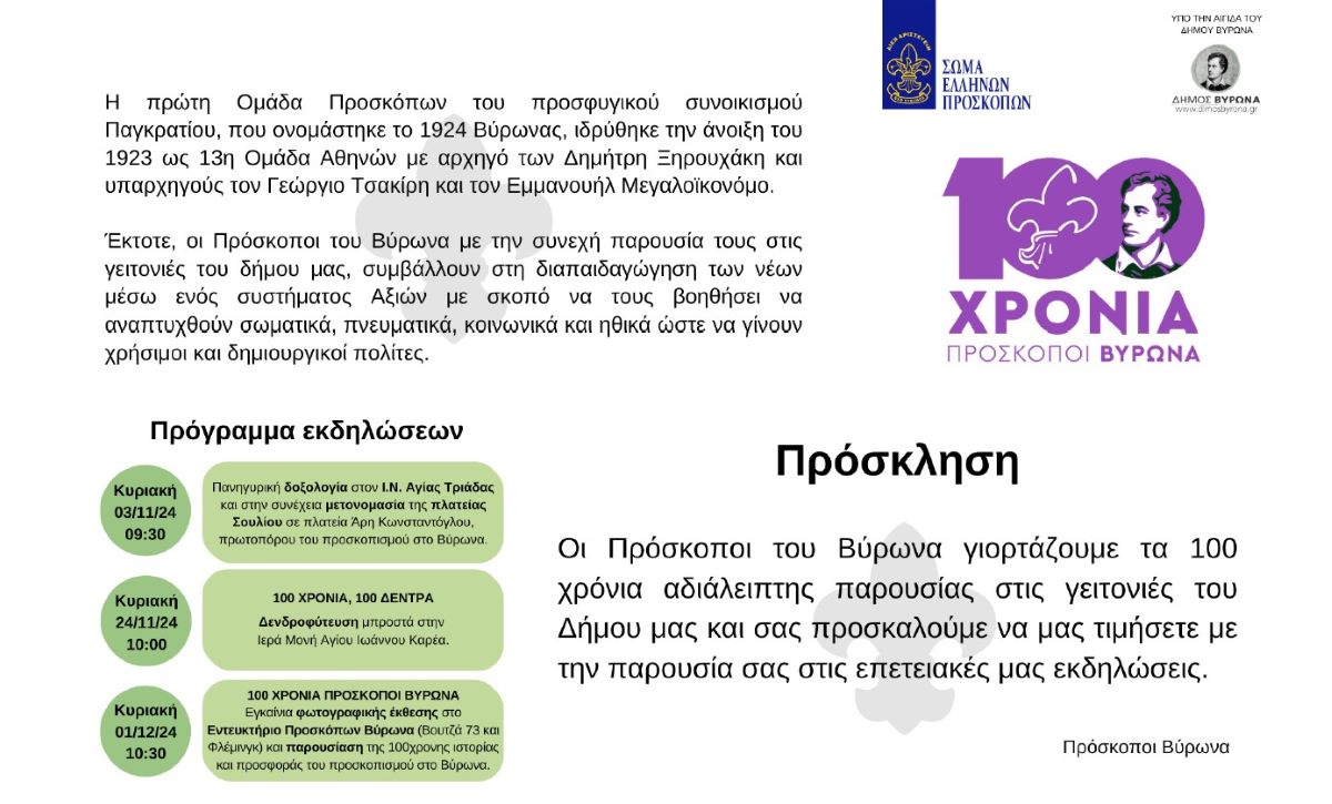 Στο πλαίσιο του εορτασμού των 100 χρόνων αδιάλειπτης παρουσίας των Προσκόπων στις γειτονιές του Δήμου Βύρωνα, οι Πρόσκοποι φυτεύουν συμβολικά 100 δέντρα, ένα για κάθε χρόνο της ιστορίας τους και προσκαλούν όλους τους συνδημότες την Κυριακή 24 Νοεμβρίου και ώρα 10.00 π.μ. μπροστά από τη Μονή Αγίου Ιωάννη Καρέα να συμβάλλουν στη δενδροφύτευση.