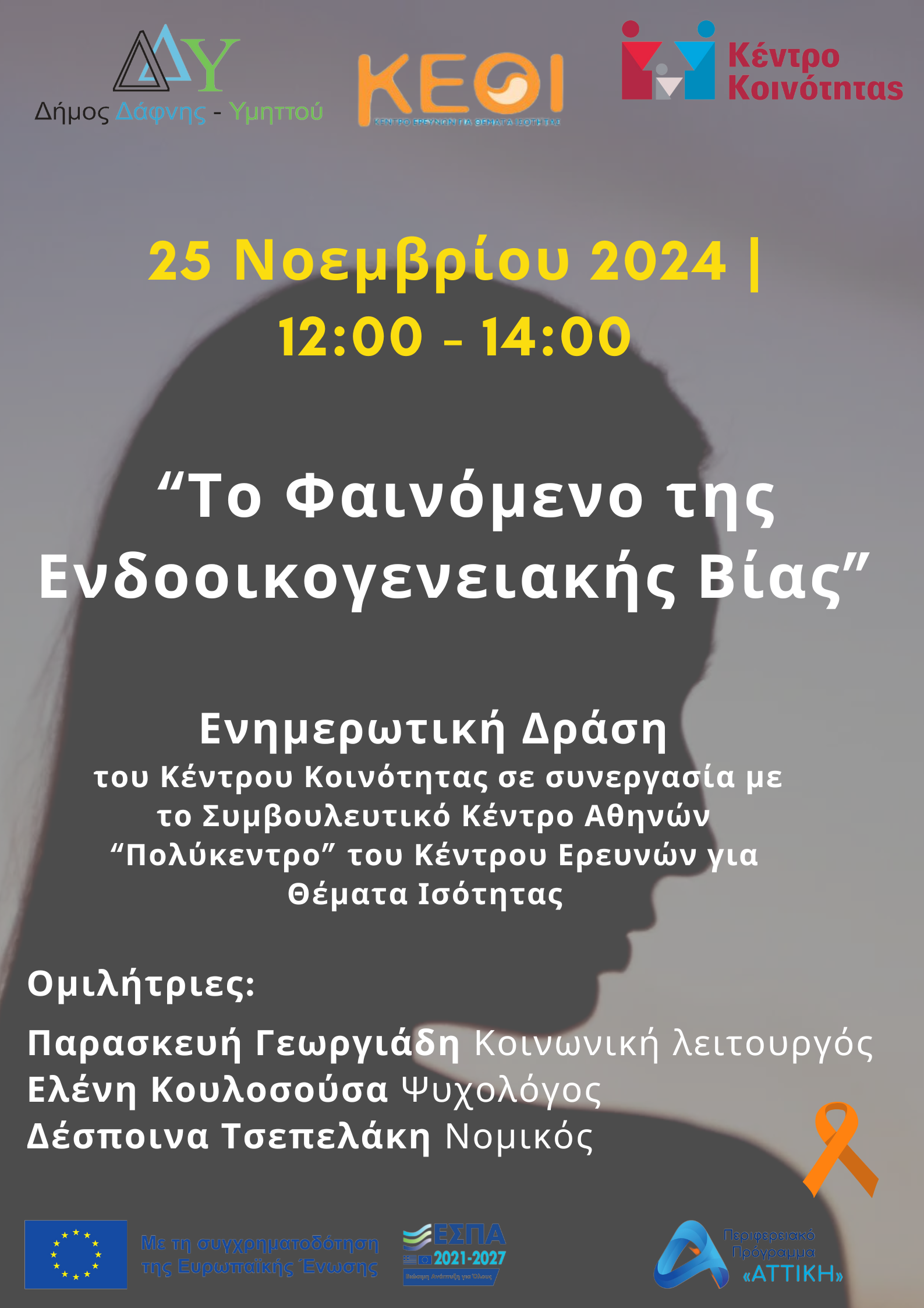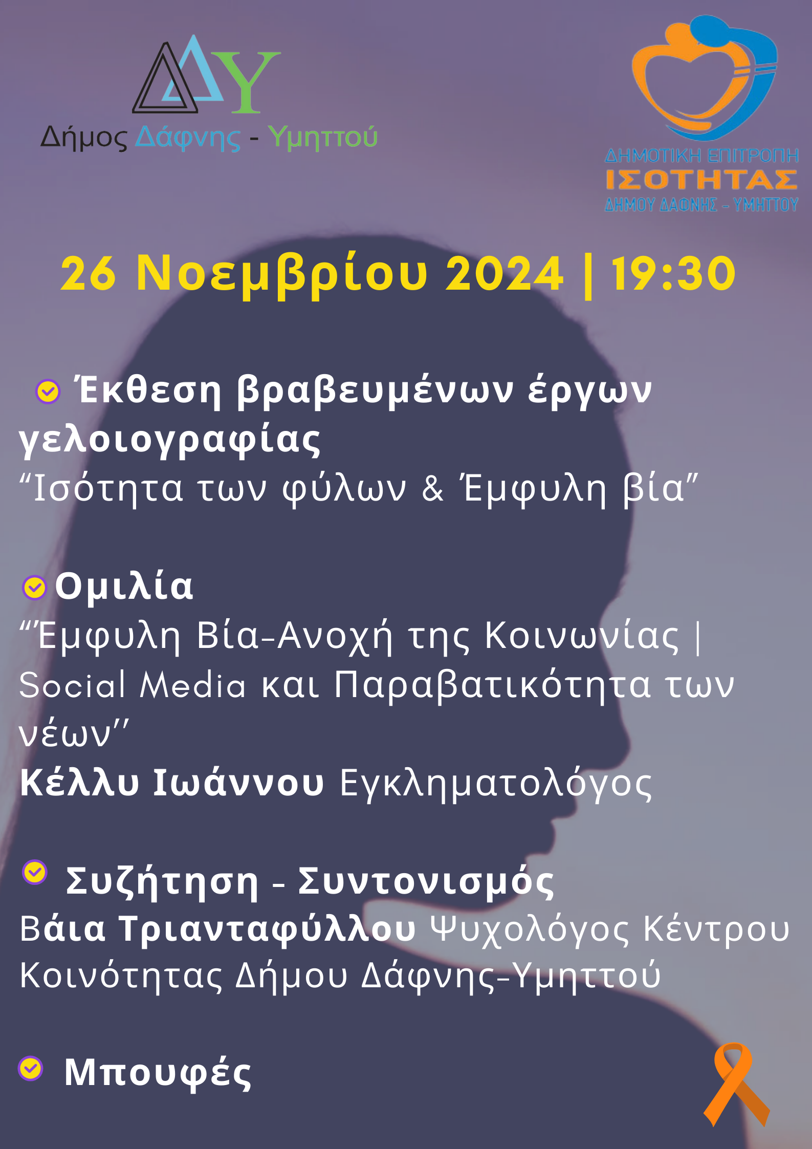 Ο Δήμος Δάφνης-Υμηττού, με αφορμή την Παγκόσμια Ημέρα Εξάλειψης της Βίας κατά των Γυναικών, διοργανώνει Διημερίδα ευαισθητοποίησης και ενημέρωσης για τα θέματα έμφυλης και ενδοοικογενειακής βίας. Στόχος της διημερίδας είναι η ενημέρωση και κινητοποίηση της τοπικής κοινωνίας σε καίρια ζητήματα που επηρεάζουν τις γυναίκες και ευρύτερα την οικογένεια.