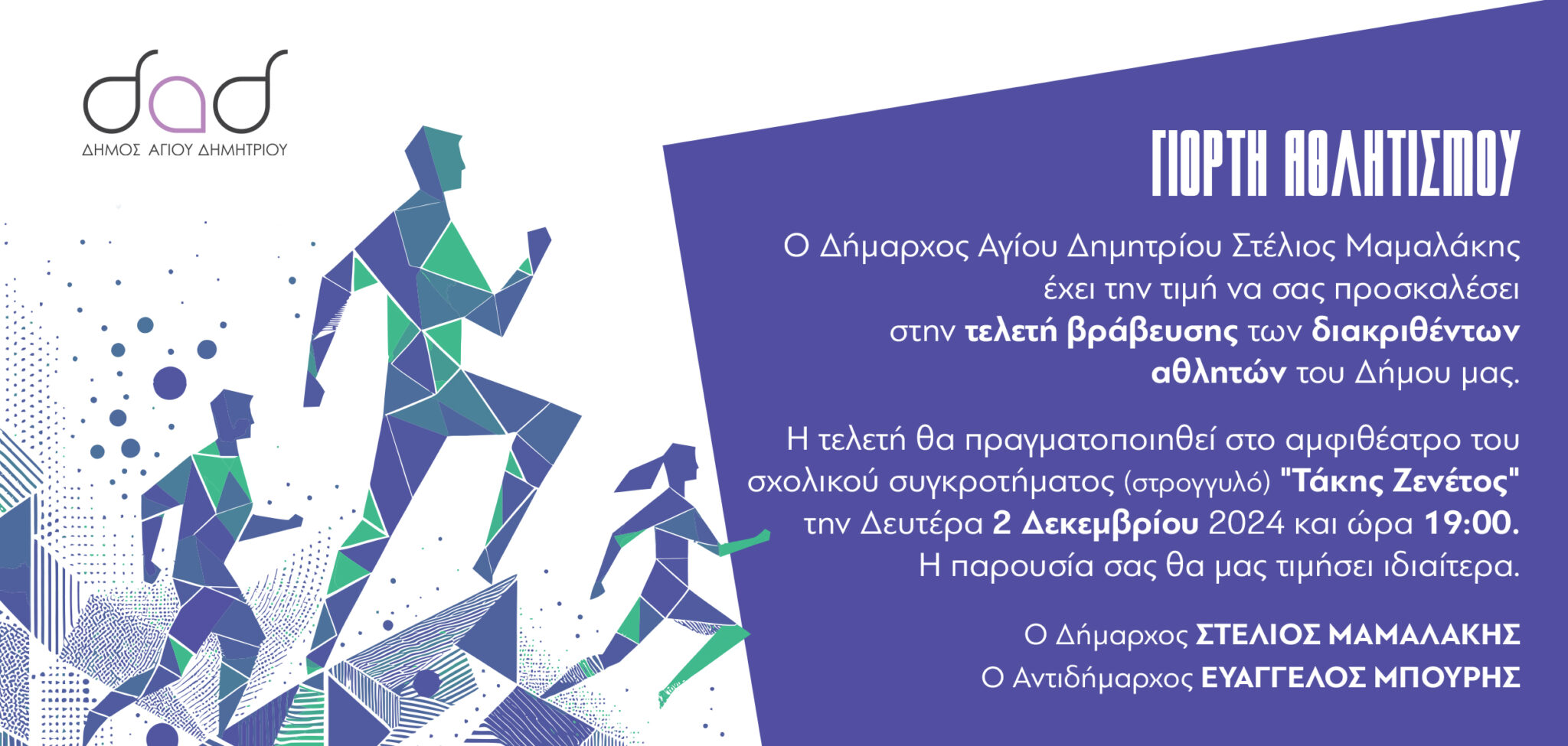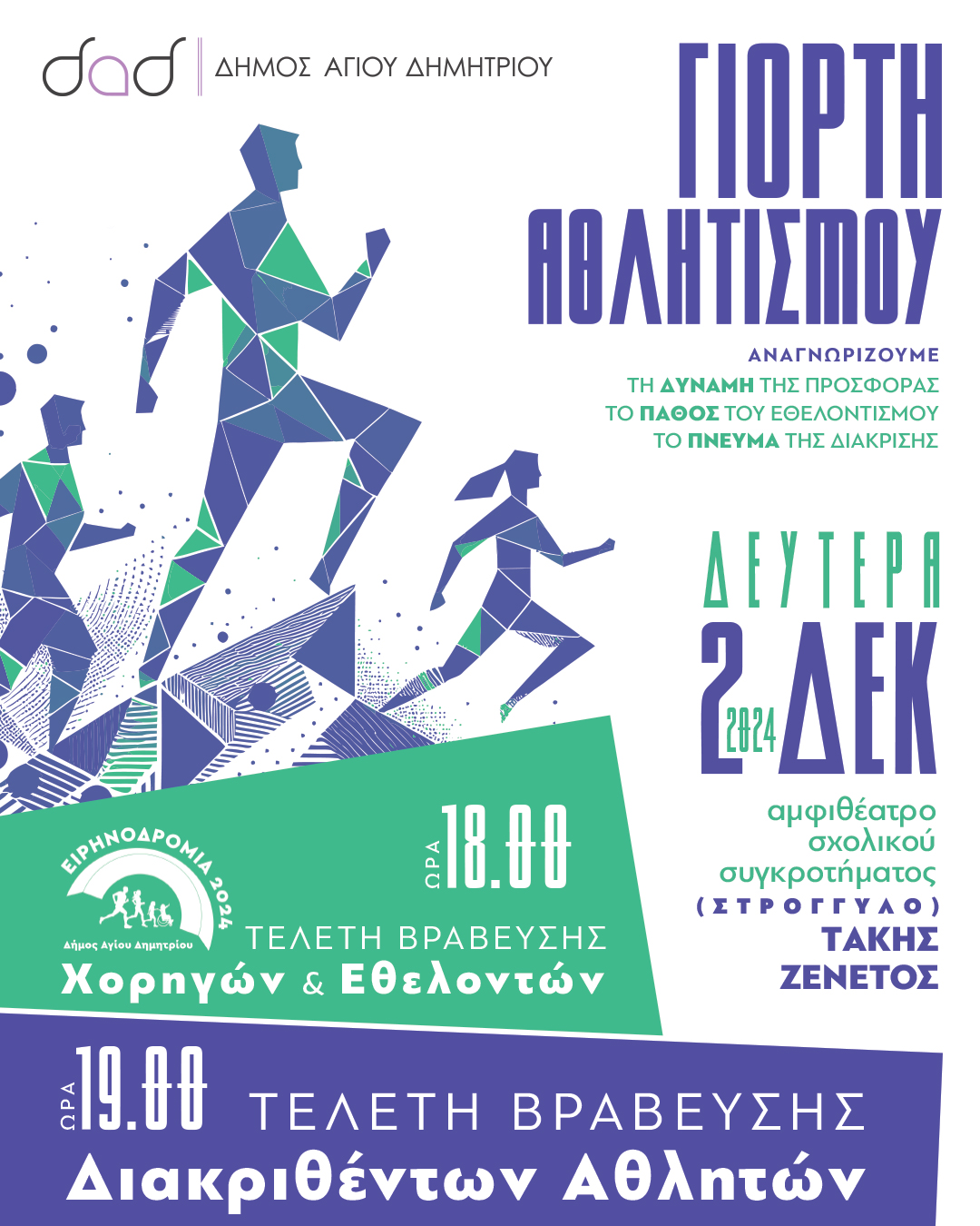 Φέτος ο Δήμος Αγίου Δημητρίου οργανώνει τη «Γιορτή Αθλητισμού 2024», με σκοπό να τιμήσει τους Αθλητές, τους Εθελοντές και τους Χορηγούς!