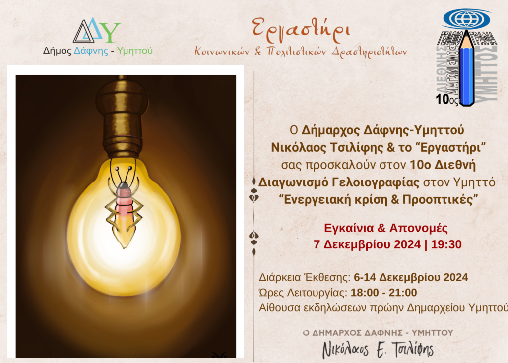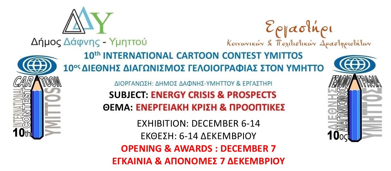 Φέτος διοργανώνεται για 10η χρονιά ο Διεθνής Διαγωνισμός Γελοιογραφίας (10th International Cartoon Contest”Ymittos”/Greece,2024) από τον Δήμο Δάφνης-Υμηττού και το «Εργαστήρι» με θέμα «Ενεργειακή Κρίση & Προοπτικές».
