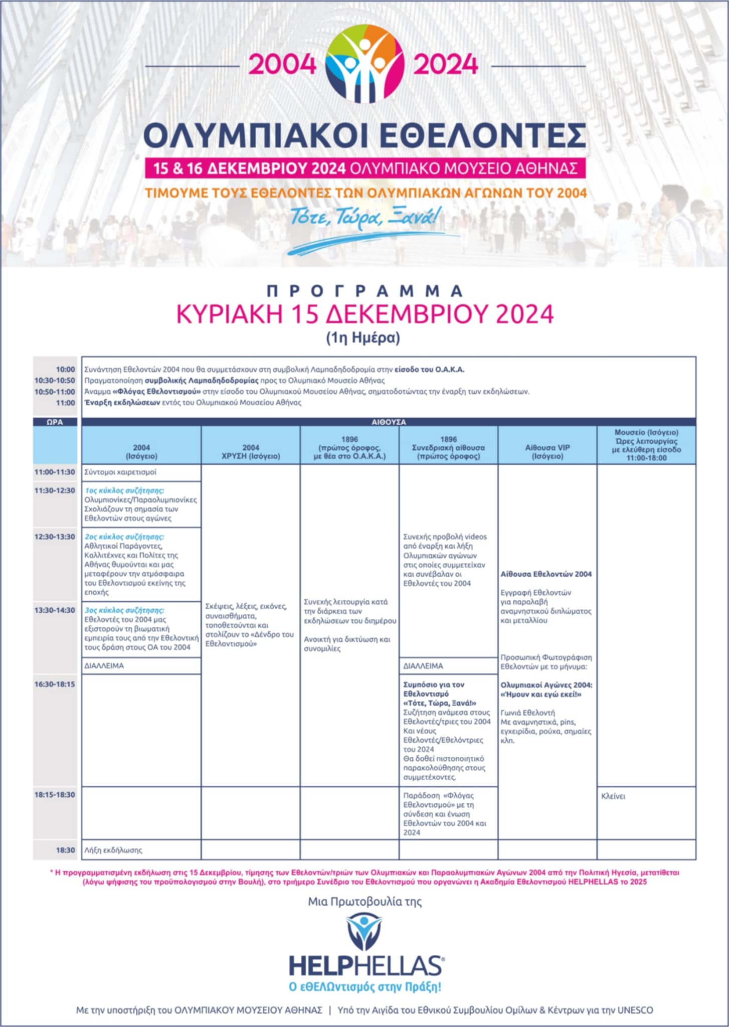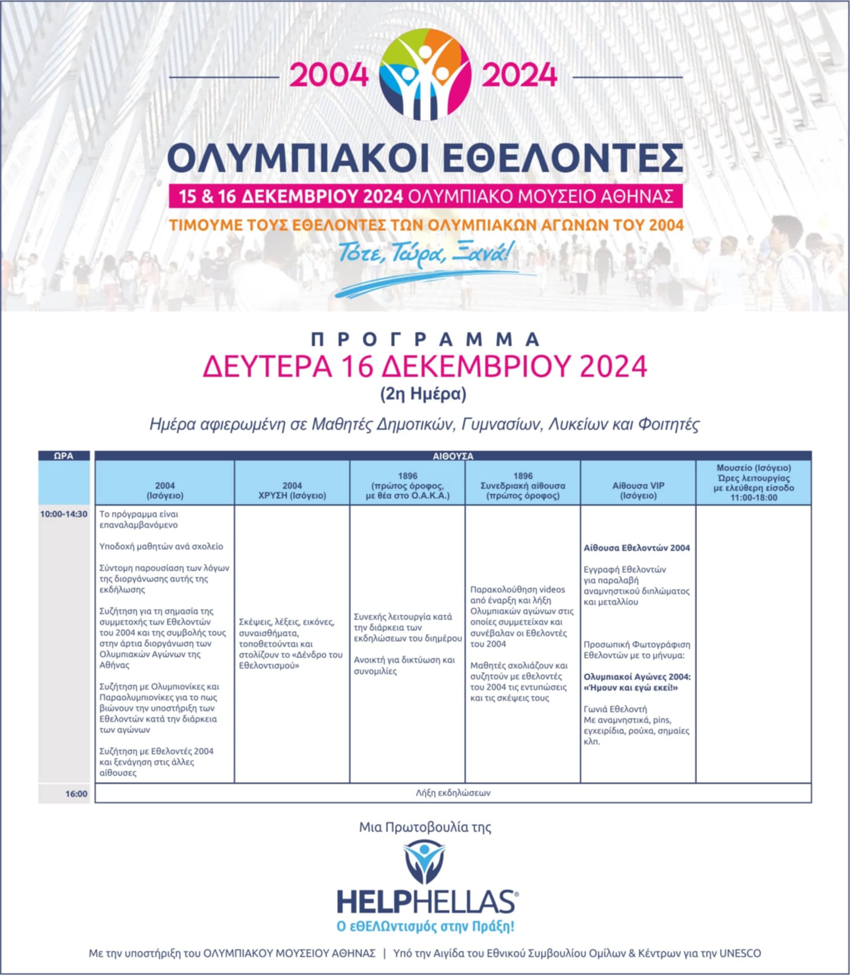 Φέτος συμπληρώνονται 20 χρόνια από την πιο επιτυχημένη διοργάνωση Ολυμπιακών Αγώνων το 2004 και η Ακαδημία Εθελοντισμού HELPHELLAS διοργανώνει φέτος ένα διήμερο εκδηλώσεων στις 15 & 16 Δεκεμβρίου στους φιλόξενους χώρους του Ολυμπιακού Μουσείου Αθήνας ( GOLDEN HALL), αποκλειστικά αφιερωμένο στους Εθελοντές και Εθελόντριες των Ολυμπιακών & Παραολυμπιακών Αγώνων στην Αθήνα το 2004.