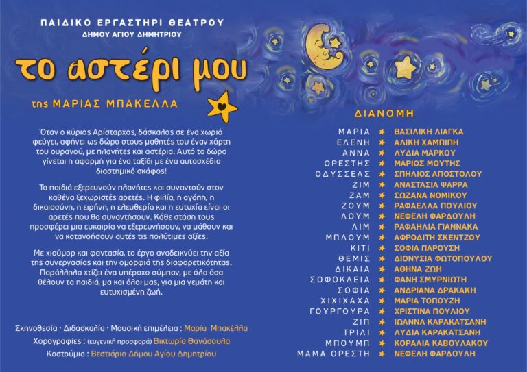 Το Παιδικό Εργαστήρι Θεάτρου του Δήμου Αγίου Δημητρίου παρουσιάζει το έργο «Το Αστέρι Μου», μια διαδραστική παράσταση που φιλοδοξεί θα μαγέψει μικρούς και μεγάλους. Την παράσταση σε σκηνοθεσία, διδασκαλία και μουσική έχει επιμεληθεί η Μαρία Μπακέλλα. Οι χορογραφίες είναι της Βικτωρίας Θανάσουλα και τα κοστούμια από το βεστιάριο Δήμου Αγίου Δημητρίου.