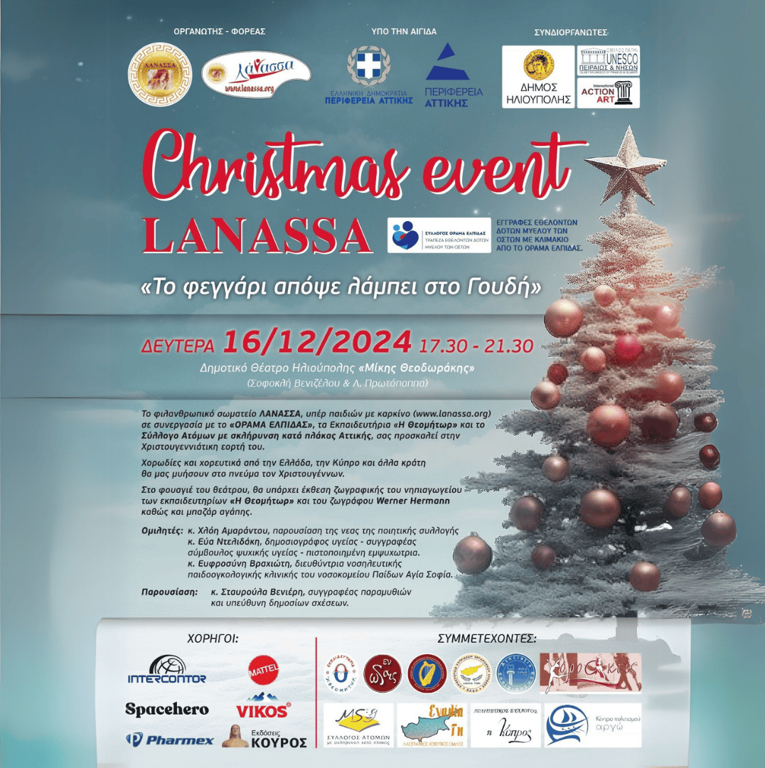 Το φιλανθρωπικό σωματείο «Λάνασσα– Υπέρ παιδιών με καρκίνο», προσκαλεί όλους τους Δημότες στην Χριστουγεννιάτικη εορτή του, που συνδιοργανώνει με το Δήμο Ηλιούπολης, την UNESCO Πειραιώς & Νήσων και την Action Art International, τη Δευτέρα 16 Δεκεμβρίου 2024 στις 17:30 στο Δημοτικό Θέατρο Ηλιούπολης «Μίκης Θεοδωράκης».