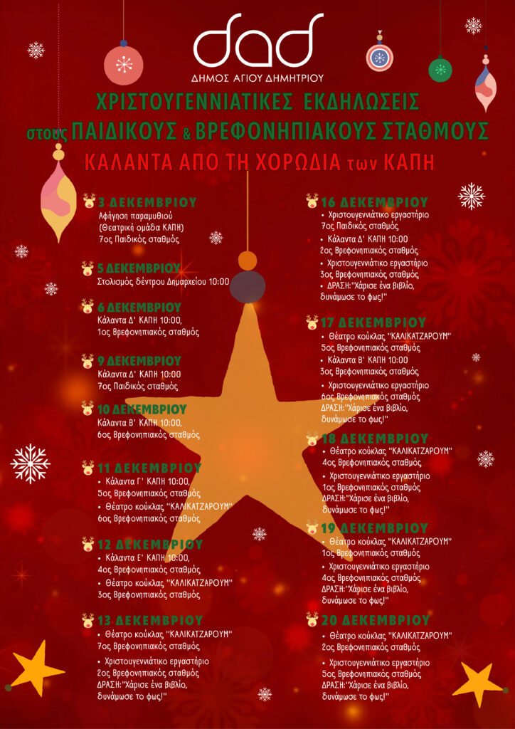 Γεμάτα χαρούμενες εορταστικές εκδηλώσεις είναι φέτος τα Χριστούγεννα στους Παιδικούς & Βρεφονηπιακούς Σταθμούς του Δήμου Αγίου Δημητρίου, με μια πληθώρα δράσεων που σχεδιάστηκαν με απεριόριστη αγάπη για να λαμπρύνουν ακόμη περισσότερο τα φωτεινά χαμόγελα των παιδιών!