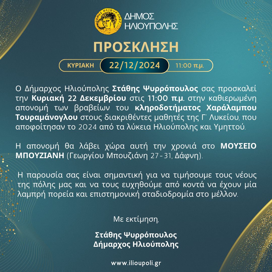 Ο Δήμαρχος Ηλιούπολης Στάθης Ψυρρόπουλος προσκαλεί όλους τους Δημότες στην καθιερωμένη απονομή των βραβείων του κληροδοτήματος Χαράλαμπου Τουραμάνογλου στους διακριθέντες μαθητές της Γ’ Λυκείου, που αποφοίτησαν το 2024 από τα λύκεια Ηλιούπολης και Υμηττού.