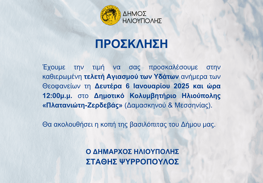 Ο Δήμος Ηλιούπολης και η Δημοτική Αρχή  προσκαλούν όλους τους Δημότες στην καθιερωμένη τελετή Αγιασμού των Υδάτων ανήμερα των Θεοφανείων, τη Δευτέρα 6 Ιανουαρίου 2025.