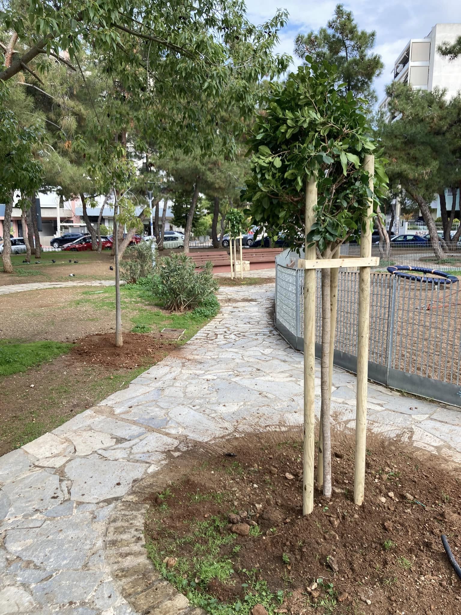 Συγκεκριμένα, στην Πλατεία, αφού εγκαταστάθηκε νέο αρδευτικό δίκτυο, αναδιαρθρώθηκαν οι χωμάτινες επιφάνειές της και καθαρίστηκε ο χώρος, γίνανε ήδη οι πρώτες φυτεύσεις στις στρογγυλές δενδροδόχους που κείτονταν κενές εδώ και χρόνια. Στις δενδροδόχους τοποθετήθηκαν Ροδίτικοι Φίκοι που θα μεγαλώσουν και θα αναπτύξουν ένα πλούσιο φύλλωμα προσφέροντας δροσιά και σκιά.