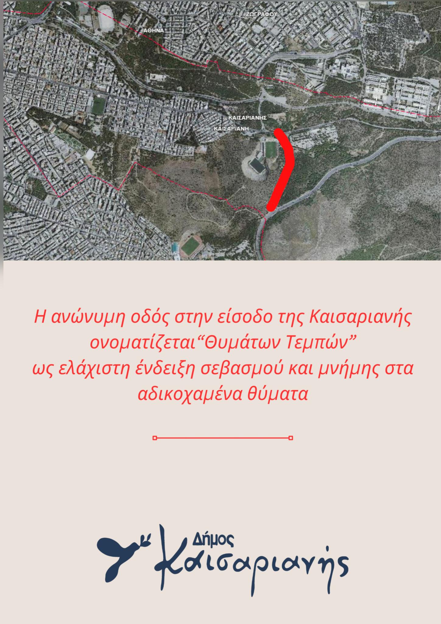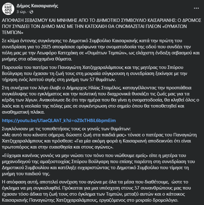 «Σε κλίμα έντονης συγκίνησης το Δημοτικό Συμβούλιο Καισαριανής κατά την πρώτη του συνεδρίαση για το 2025 αποφάσισε ομόφωνα την ονοματοδοσία της οδού που συνδέει την πόλη μας με την Λεωφόρο Κατεχάκη σε «Θυμάτων Τεμπών», ως ελάχιστη ένδειξη σεβασμού και μνήμης στα αδικοχαμένα θύματα.