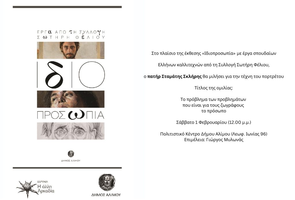 Η Δημοτική Πινακοθήκη σε συνεργασία με το Ανοιχτό Πανεπιστήμιο του Δήμου Αλίμου προσκαλούν τους κατοίκους και δημότες στη διάλεξη του πατρός Σταμάτη Σκλήρη με θέμα: «Το πρόβλημα των προβλημάτων που είναι για τους ζωγράφους το πρόσωπο».Η ομιλία θα πραγματοποιηθεί το Σάββατο 1η Φεβρουαρίου 2025, στις 12 το μεσημέρι στο Πολιτιστικό Κέντρο του Δήμου Αλίμου (Λεωφ. Ιωνίας 96) στο πλαίσιο της εικαστικής έκθεσης με έργα από τη Συλλογή Σωτήρη Φέλιου και τίτλο «Ιδιοπροσωπία».