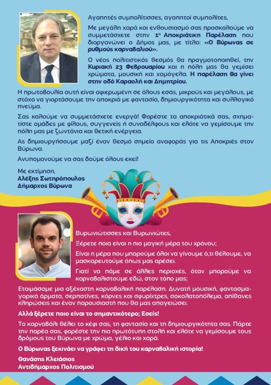 «Στους δρόμους του Βύρωνα, η παράδοση συναντά τη φαντασία και η κοινότητα γίνεται ένα. Φορέστε τις μάσκες και τα κοστούμια σας και ελάτε να δημιουργήσουμε μαζί αναμνήσεις γεμάτες γέλιο, χρώμα, αισιοδοξία και να ξεφαντώσουμε όλοι μαζί στη νέα αποκριάτικη παράδοση του Βύρωνα!», αναφέρει στην ανακοίνωση η Δημοτική αρχή.