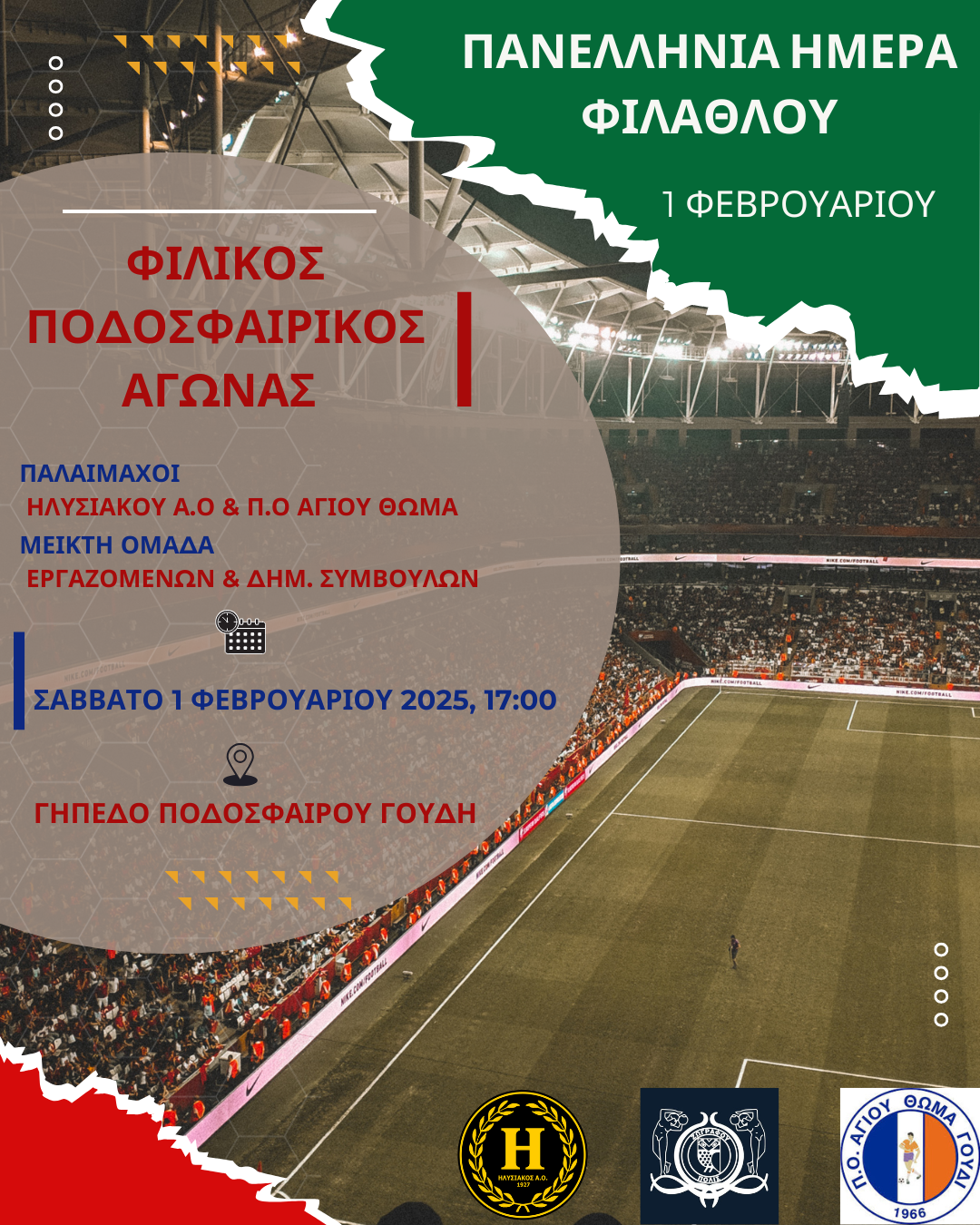 Ο αγώνας θα διεξαχθεί με τη συμμετοχή ομάδων παλαίμαχων αθλητών του ΗΛΥΣΙΑΚΟΣ Α.Ο. του Π.Ο Αγίου Θωμά Γουδί και μεικτής ομάδας εργαζομένων & Δημοτικών Συμβούλων του Δήμου.
