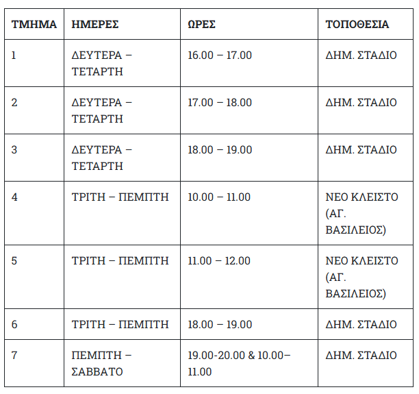 Δείτε παρακάτω τις ημέρες και τις ώρες λειτουργίας των τμημάτων: