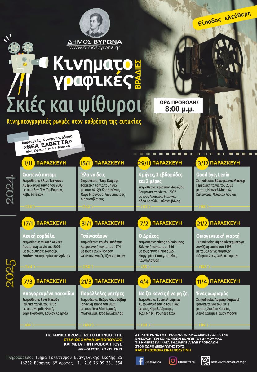 Συνεχίζονται οι Κινηματογραφικές Βραδιές του Δήμου Βύρωνα με το νέο κύκλο προβολών, με τίτλο: “Σκιές και ψίθυροι: Κινηματογραφικές ρωγμές στον καθρέφτη της ευτυχίας”, με την προβολή της ταινίας «Οικογενειακή γιορτή».