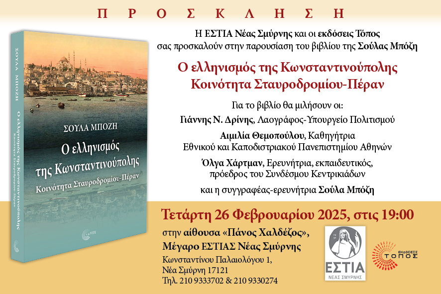 Η ΕΣΤΙΑ Νέας Σμύρνης και oι εκδόσεις Τόπος διοργανώνουν την παρουσίαση του βιβλίου της Σούλας Μπόζη, με τίτλο «Ο ελληνισμός της Κωνσταντινούπολης: Κοινότητα Σταυροδρομίου-Πέραν».