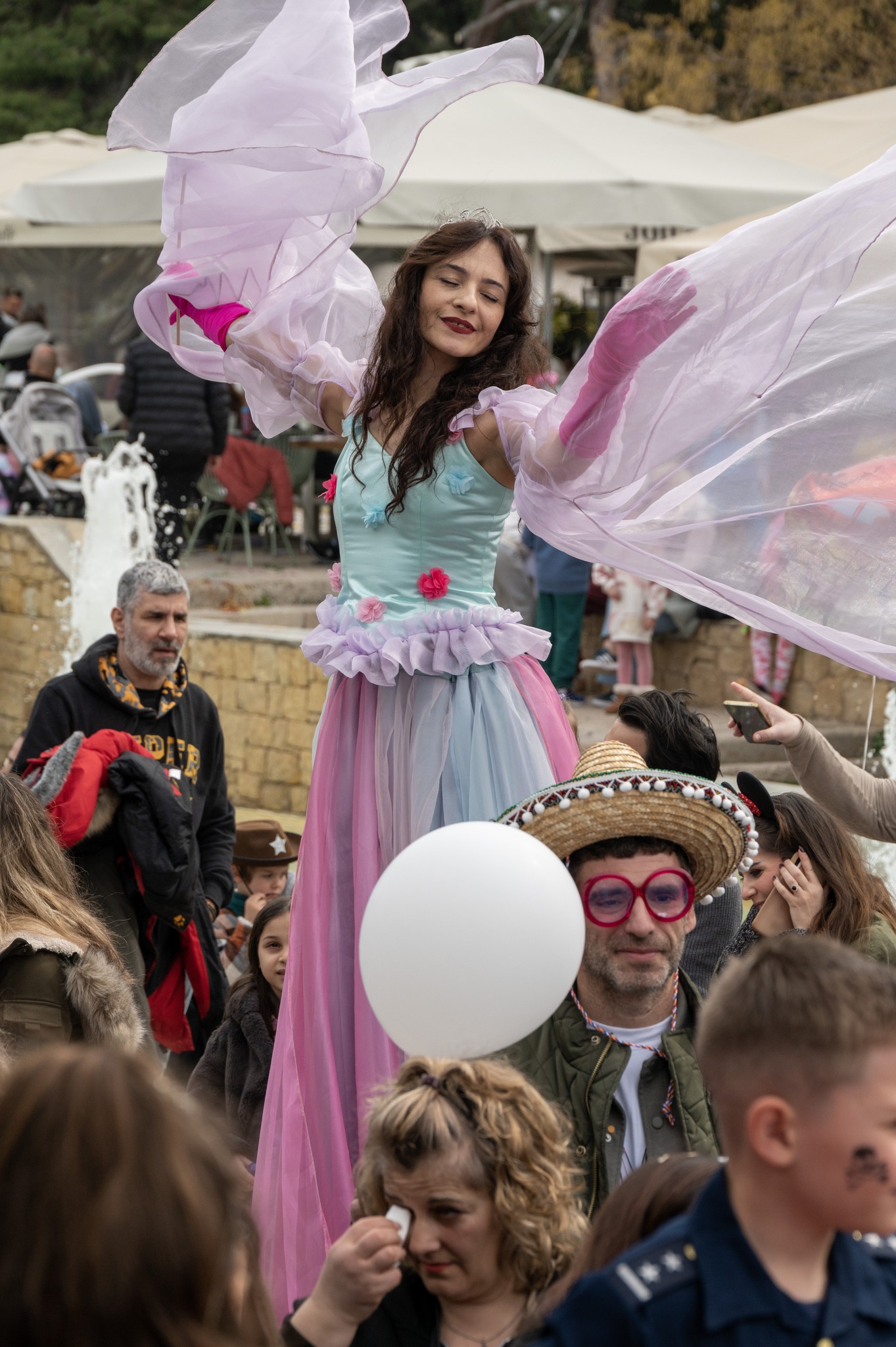 Κλόουν, ταχυδαλκτυλουργοί, ξυλοπόδαροι, διασκέδασαν τους μικρούς δημότες που στο τέλος ενώθηκαν στο χρωματιστό γαϊτανάκι και χόρεψαν με την καρδιά τους. Τον ρυθμό έδινε το αποκριάτικο τρενάκι που έκανε βόλτα μικρούς και μεγάλους στους κεντρικούς δρόμους της πόλης.