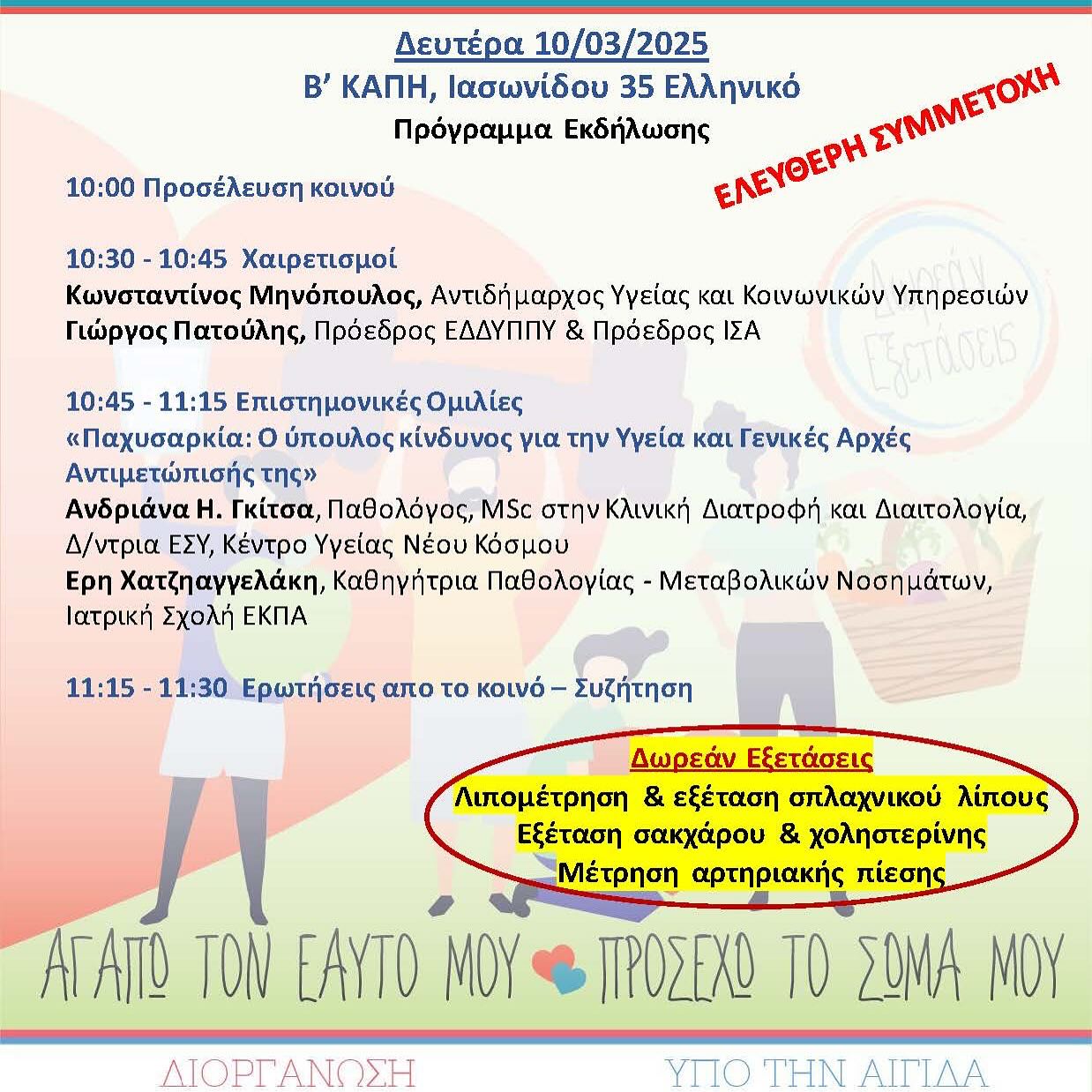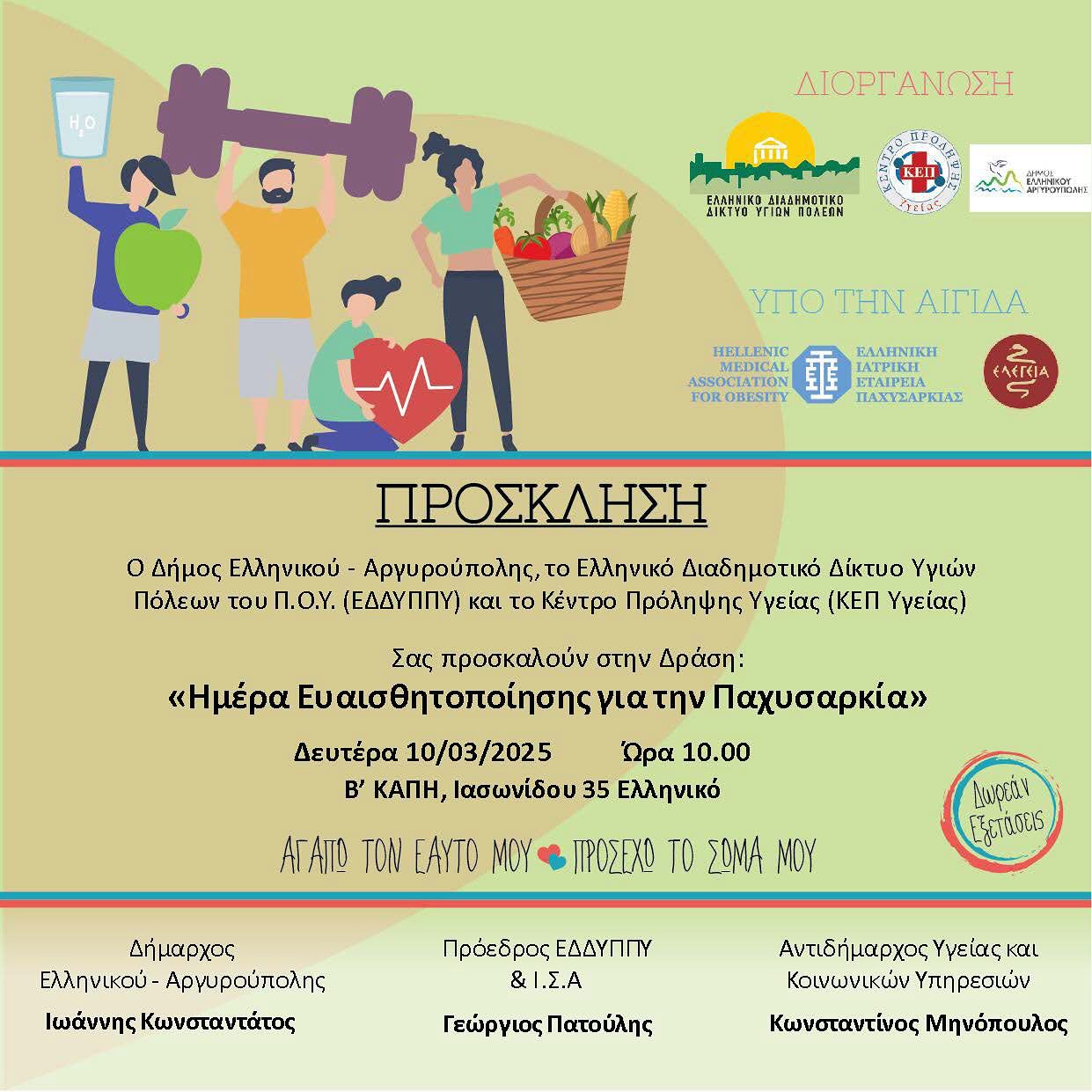 Ο Δήμος Ελληνικού-Αργυρούπολης, τo Ελληνικό Διαδημοτικό Δίκτυο Υγιών Πόλεων και το ΚΕΠ Υγείας συνδιοργανώνουν Ημερίδες Ευαισθητοποίησης για την Παχυσαρκία με τίτλο «Αγαπώ τον εαυτό μου, προσέχω το σώμα μου».
