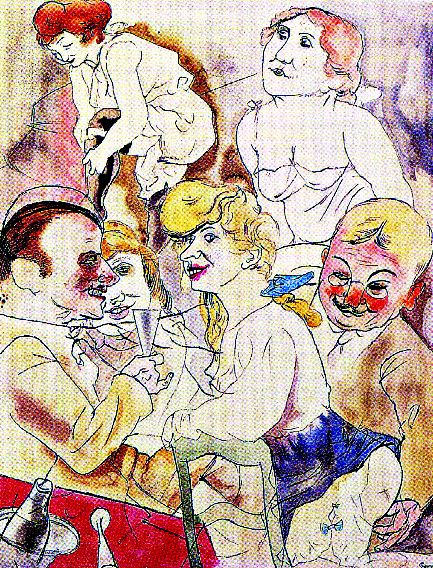 Στα χρόνια του μεσοπολέμου, η ηθική και κοινωνική εξαθλίωση που είχε επιφέρει ο Μεγάλος Πόλεμος αντικατοπτρίστηκαν στη ρεαλιστική τέχνη των Γερμανών καλλιτεχνών, όπως ο Georg Grosz που πρέσβευε ότι ο ερωτισμός έπρεπε να βρίσκεται στην υπηρεσία της κοινωνικής κριτικής. Στο έργο «Γιορτή Γενεθλίων» (1923), αποδίδεται το θέμα του αγοραίου έρωτα στους οίκους ανοχής του Βερολίνου (εικ. 2). Ο καλλιτέχνης περιγράφει με έντονη ειρωνεία και σκληρό σαρκασμό την παρακμή, τα ελαττώματα και την υποκρισία των αστών της Γερμανίας, οι οποίοι πρεσβεύουν την ηθική στον δημόσιο βίο τους, αλλά στην προσωπική τους ζωή ζουν στην απόλυτη διαφθορά.