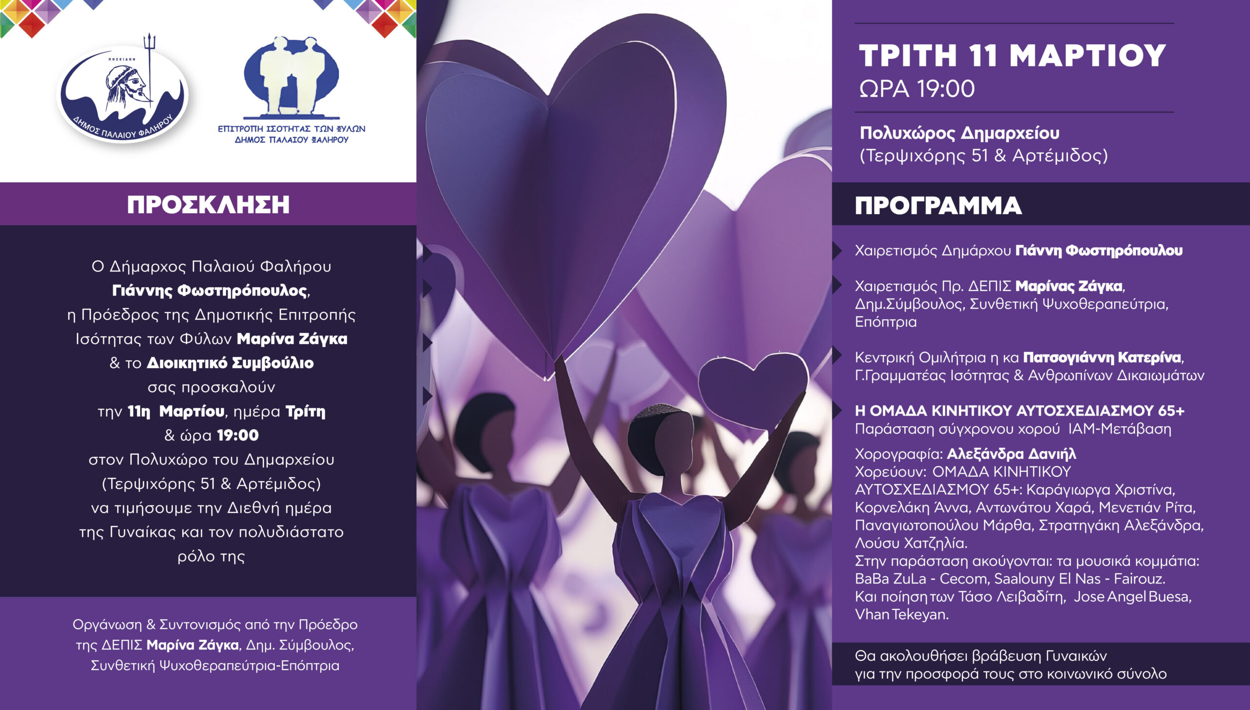 Η Δημοτική Επιτροπή Ισότητας των Φύλων, ο δήμαρχος Παλαιού Φαλήρου Γιάννης Φωστηρόπουλος και το Διοικητικό Συμβούλιο τιμούν την Παγκόσμια Ημέρα της Γυναίκας και τον πολυδιάστατο ρόλο της και προσκαλούν όλους τους πολίτες στην εκδήλωση που διοργανώνουν την Τρίτη 11η Μαρτίου & ώρα 19:00, στον Πολυχώρο του Δημαρχείου (Τερψιχόρης 51& Αρτέμιδος).