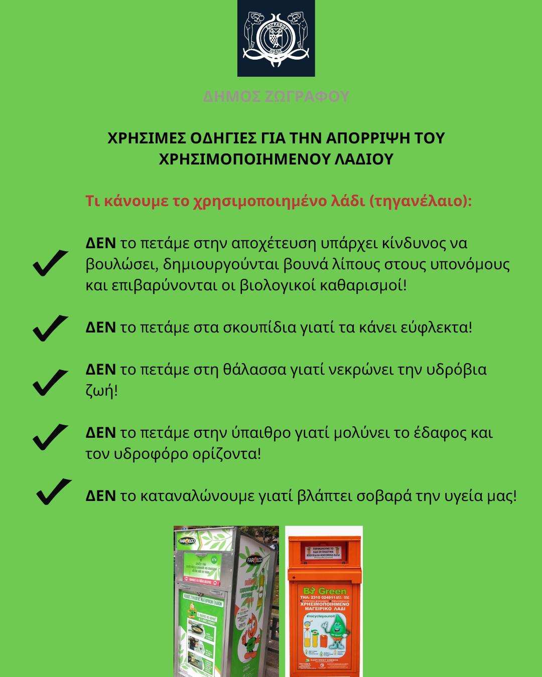 Πρόσφατα ξεκίνησε η δράση της κυκλικής ανακύκλωσης και στον δήμο, καθώς δίπλα στους ΜΩΒ κάδους για την ανακύκλωση των ενδυμάτων, υπάρχουν πλέον αντίστοιχα οι ΠΡΑΣΙΝΟΙ και οι ΠΟΡΤΟΚΑΛΙ κάδοι για την απόρριψη των χρησιμοποιημένων λαδιών (τηγανέλαια).