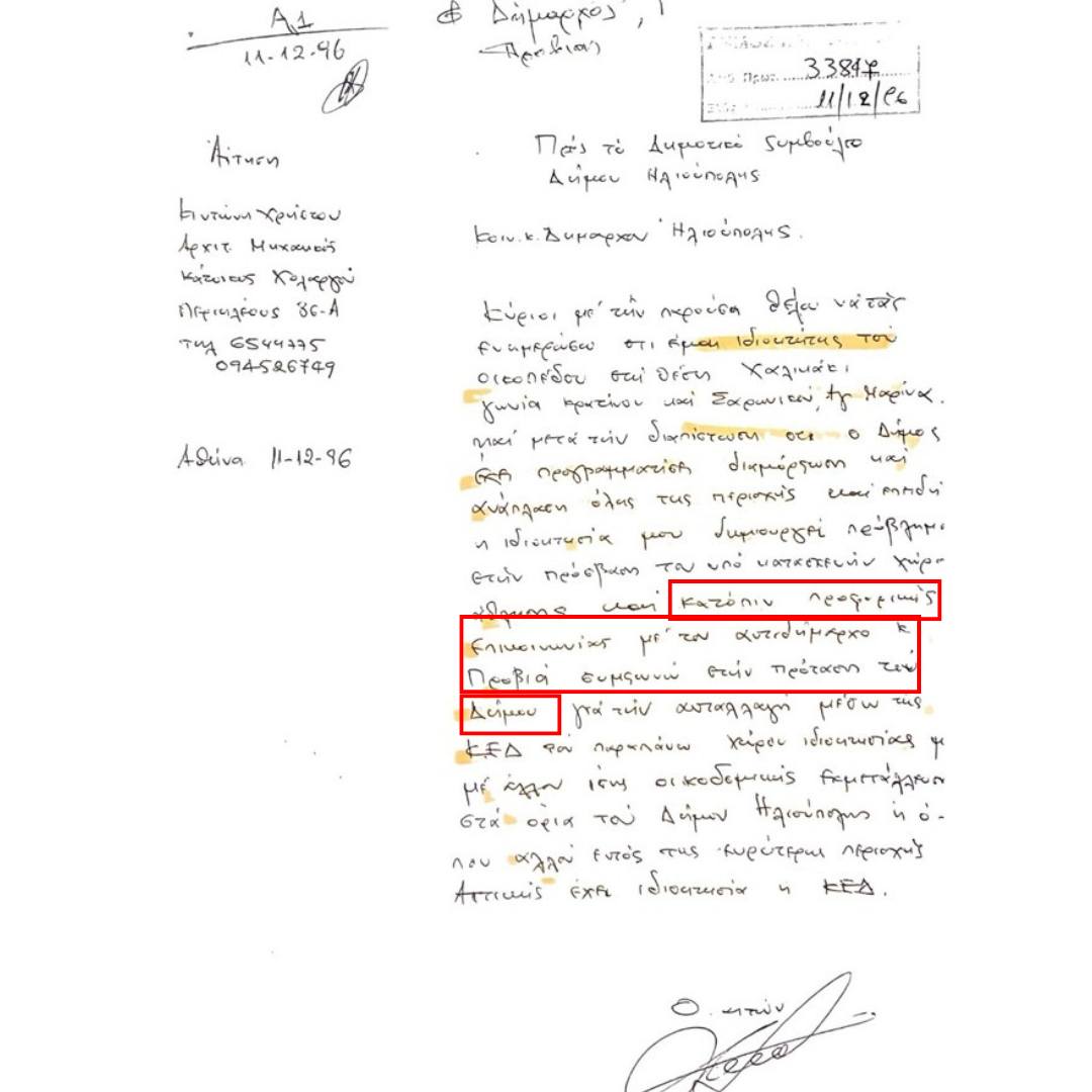 Ειδικότερα, μετά από μια σειρά συμβολαιογραφικών πράξεων των ιδιοκτητών, οι τελευταίοι έλαβαν από το 1987 έγγραφο από τον Δήμο Ηλιούπολης για την μη οφειλή φόρου ακαλύπτων χώρων ή εισφοράς λόγω επεκτάσεως της πόλης, ενώ το έτος 1997, οι ιδιοκτήτες υπέβαλαν την με αριθμό 33847/1996 αίτηση προς το Δημοτικό Συμβούλιο της Ηλιούπολης, στην οποία αναφέρουν ρητά ότι είναι ιδιοκτήτες του ως άνω ακινήτου και ότι σε προφορική συνεννόηση με τον Δημοτικό Σύμβουλο κ. Προβιά ζήτησαν την ανταλλαγή του μέσω της Κτηματικής Υπηρεσίας του Δημοσίου με άλλο ακίνητο ίσης οικοδομικής εκμετάλλευσης στα όρια του Δήμου Ηλιούπολης ή όπου άλλου εντός της Αττικής έχει ακίνητο η ΚΕΔ. Στις 28-1-1997 το Δημοτικό Συμβούλιο αποφάσισε μετά από εισήγηση του τότε Αντιδημάρχου Τεχνικών Υπηρεσιών ΟΜΟΦΩΝΑ να εξουσιοδοτήσουν τον τότε Δήμαρχο Θεόδωρο Γεωργάκη να προβεί στην ανταλλαγή του οικοπέδου με άλλο οικόπεδο.