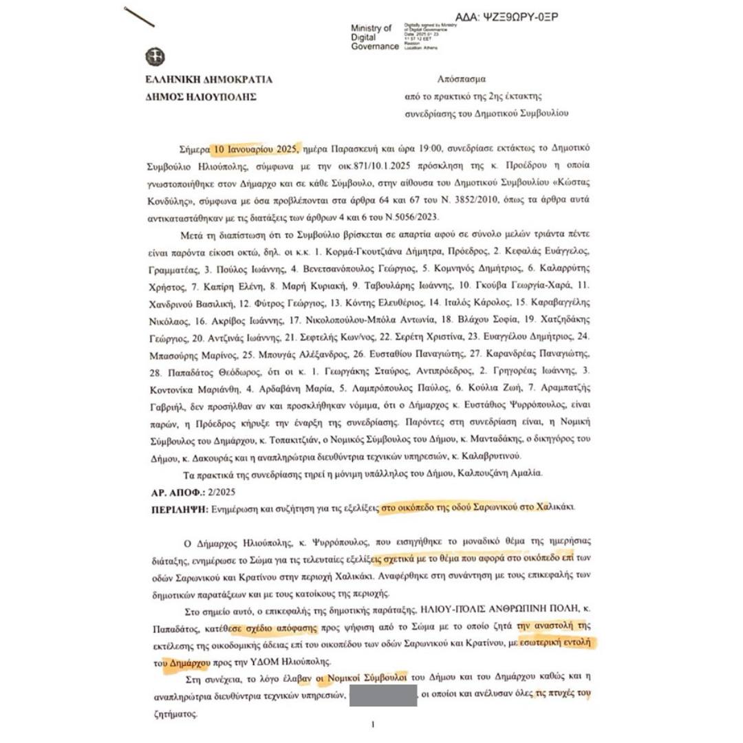 Αναλυτικότερα, παρατίθεται αυτούσια η επιστολή του Δημάρχου Ηλιούπολης Στάθη Ψυρρόπουλου, που δόθηκε στη δημοσιότητα και τα σχετικά έγγραφα που την συνόδευσαν: