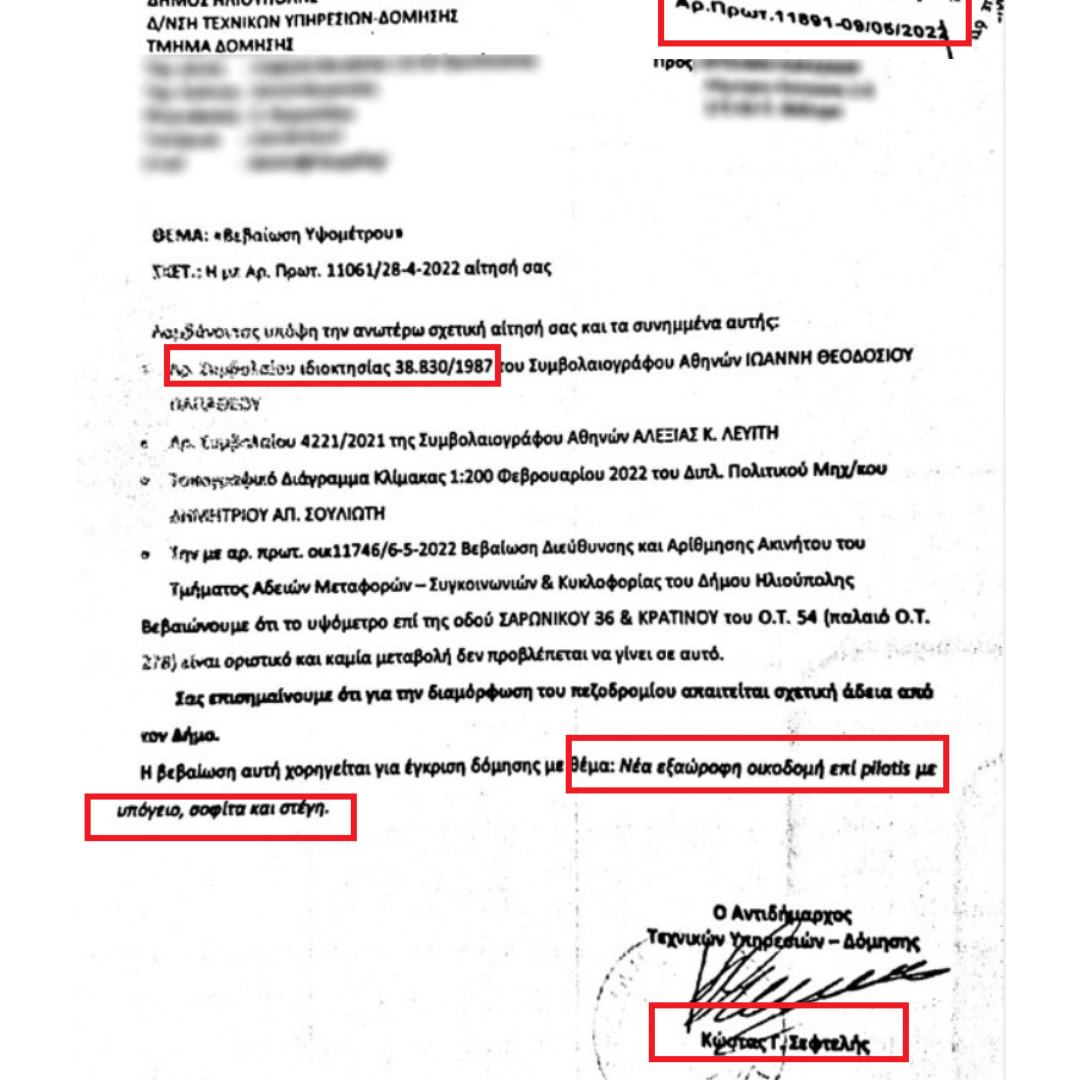 Το 2022 έλαβε ο ιδιοκτήτης και βεβαίωση υψομέτρου με Αρ. Πρωτ. 11061/28-04-2022, η οποία είναι απαραίτητη για την οικοδόμηση του ακινήτου με υπογραφή του ΤΟΤΕ ΑΝΤΙΔΗΜΑΡΧΟΥ ΤΕΧΝΙΚΩΝ ΥΠΗΡΕΣΙΩΝ-ΔΟΜΗΣΗΣ κ. ΚΩΣΤΑ ΣΕΦΤΕΛΗ για νέα εξαώροφη οικοδομή επί PILOTIS με υπόγειο, σοφίτα και στέγη, στην οποία βασίστηκε αποκλειστικά η ως άνω έκδοση αδείας.