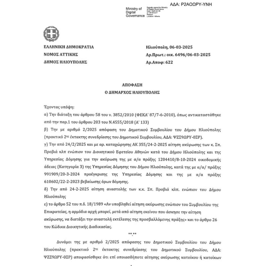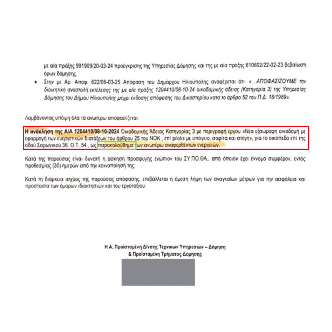 Εν συνεχεία η διεύθυνση τεχνικών υπηρεσιών-δόμησης του Δήμου Ηλιούπολης αποφάσισε την ανάκληση της ως άνω οικοδομικής άδειας στις 11 Μαρτίου 2025 ως παρακολούθημα της ως άνω απόφασης μου και όχι λόγω ενεργειών που κάποιοι δολίως προσπαθούν να οικειοποιηθούν, προκειμένου να εξυπηρετήσουν δικά τους πολιτικά συμφέροντα, αναφερόμενοι σε δήθεν οριστική δικαστική κρίση ή δήθεν οριστική ανάκληση λόγω πολεοδομικών σφαλμάτων, ρίχνοντας λάσπη στη σημερινή διοίκηση του Δήμου Ηλιούπολης.
