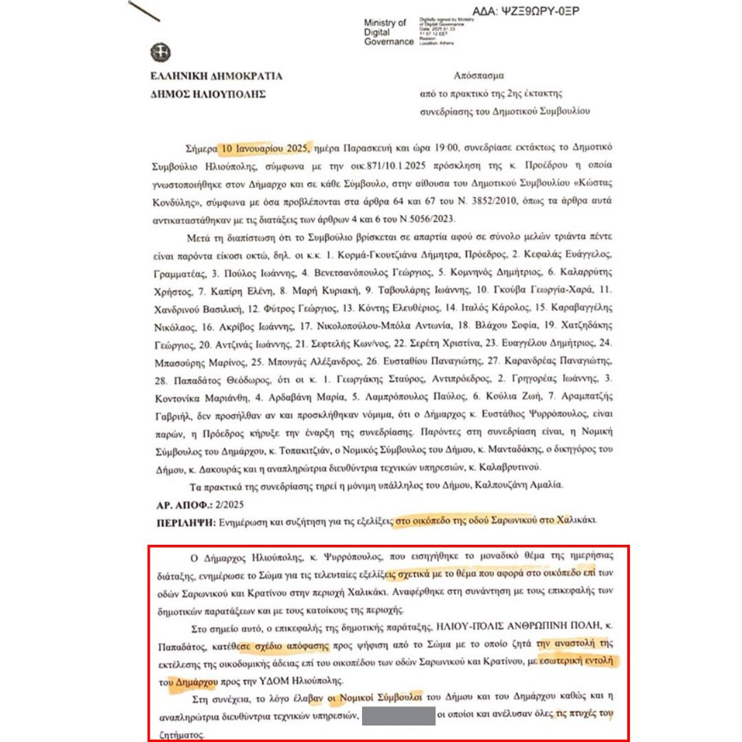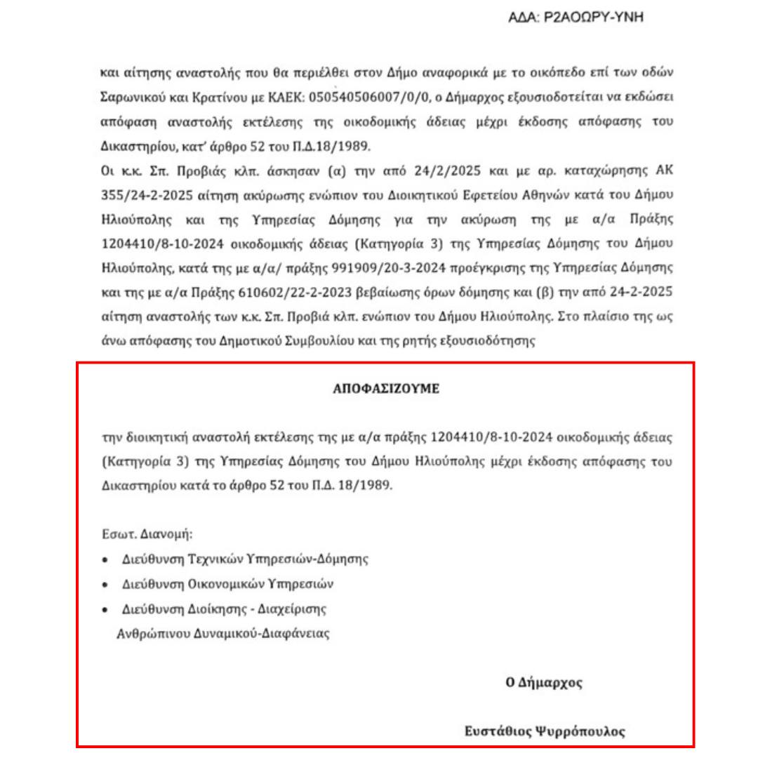 Το δικόγραφο αυτό ασκήθηκε και εισήχθη στο πρωτόκολλο του Δήμου στις 25 Φεβρουαρίου 2025 μετά από 46 ημέρες από την λήψη της απόφασης του Δημοτικού Συμβουλίου και μέσα σε 4 εργάσιμες μέρες η Διοίκηση συνεργάστηκε με τη Νομική Υπηρεσία και την Διεύθυνση Τεχνικών Υπηρεσιών και Δόμησης για τις δέουσες ενέργειες έκδοσης απόφασης της αναστολής εκτέλεσης οικοδομικής άδειας της Υπηρεσίας του Δήμου Ηλιούπολης στην περιοχή Χαλικάκι μετά από αίτηση ακύρωσης και αίτησης αναστολής που ασκήθηκε από κατοίκους της περιοχής.