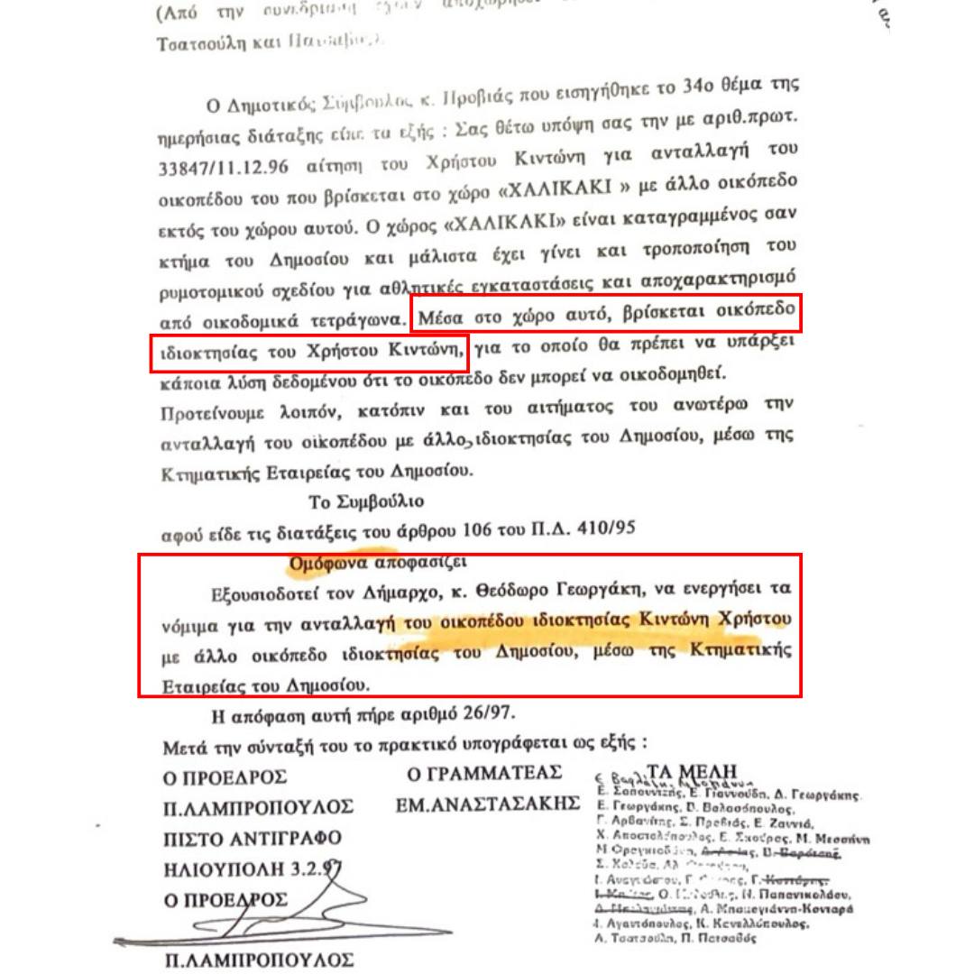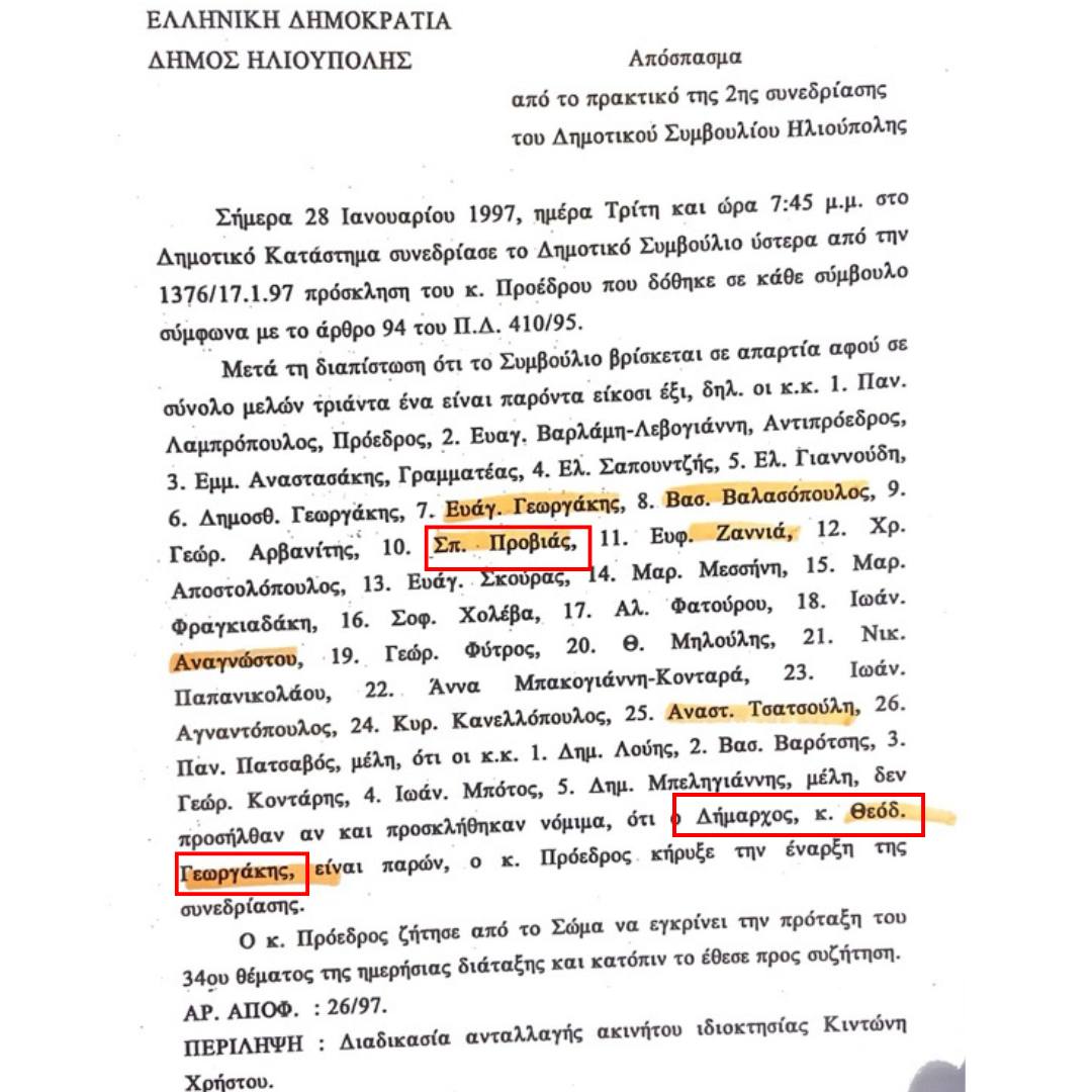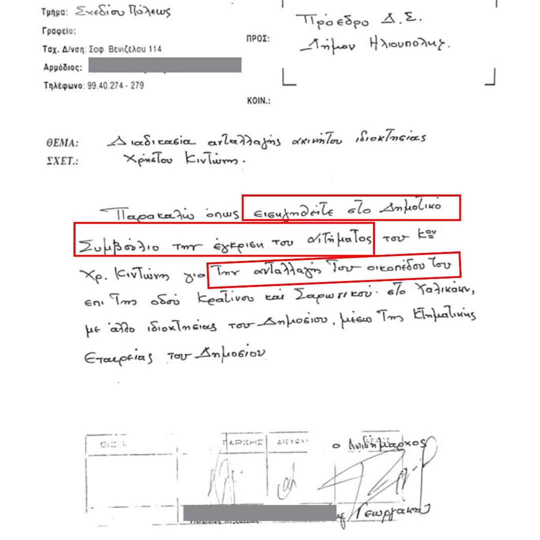 Ειδικότερα, μετά από μια σειρά συμβολαιογραφικών πράξεων των ιδιοκτητών, οι τελευταίοι έλαβαν από το 1987 έγγραφο από τον Δήμο Ηλιούπολης για την μη οφειλή φόρου ακαλύπτων χώρων ή εισφοράς λόγω επεκτάσεως της πόλης, ενώ το έτος 1997, οι ιδιοκτήτες υπέβαλαν την με αριθμό 33847/1996 αίτηση προς το Δημοτικό Συμβούλιο της Ηλιούπολης, στην οποία αναφέρουν ρητά ότι είναι ιδιοκτήτες του ως άνω ακινήτου και ότι σε προφορική συνεννόηση με τον Δημοτικό Σύμβουλο κ. Προβιά ζήτησαν την ανταλλαγή του μέσω της Κτηματικής Υπηρεσίας του Δημοσίου με άλλο ακίνητο ίσης οικοδομικής εκμετάλλευσης στα όρια του Δήμου Ηλιούπολης ή όπου άλλου εντός της Αττικής έχει ακίνητο η ΚΕΔ. Στις 28-1-1997 το Δημοτικό Συμβούλιο αποφάσισε μετά από εισήγηση του τότε Αντιδημάρχου Τεχνικών Υπηρεσιών ΟΜΟΦΩΝΑ να εξουσιοδοτήσουν τον τότε Δήμαρχο Θεόδωρο Γεωργάκη να προβεί στην ανταλλαγή του οικοπέδου με άλλο οικόπεδο.