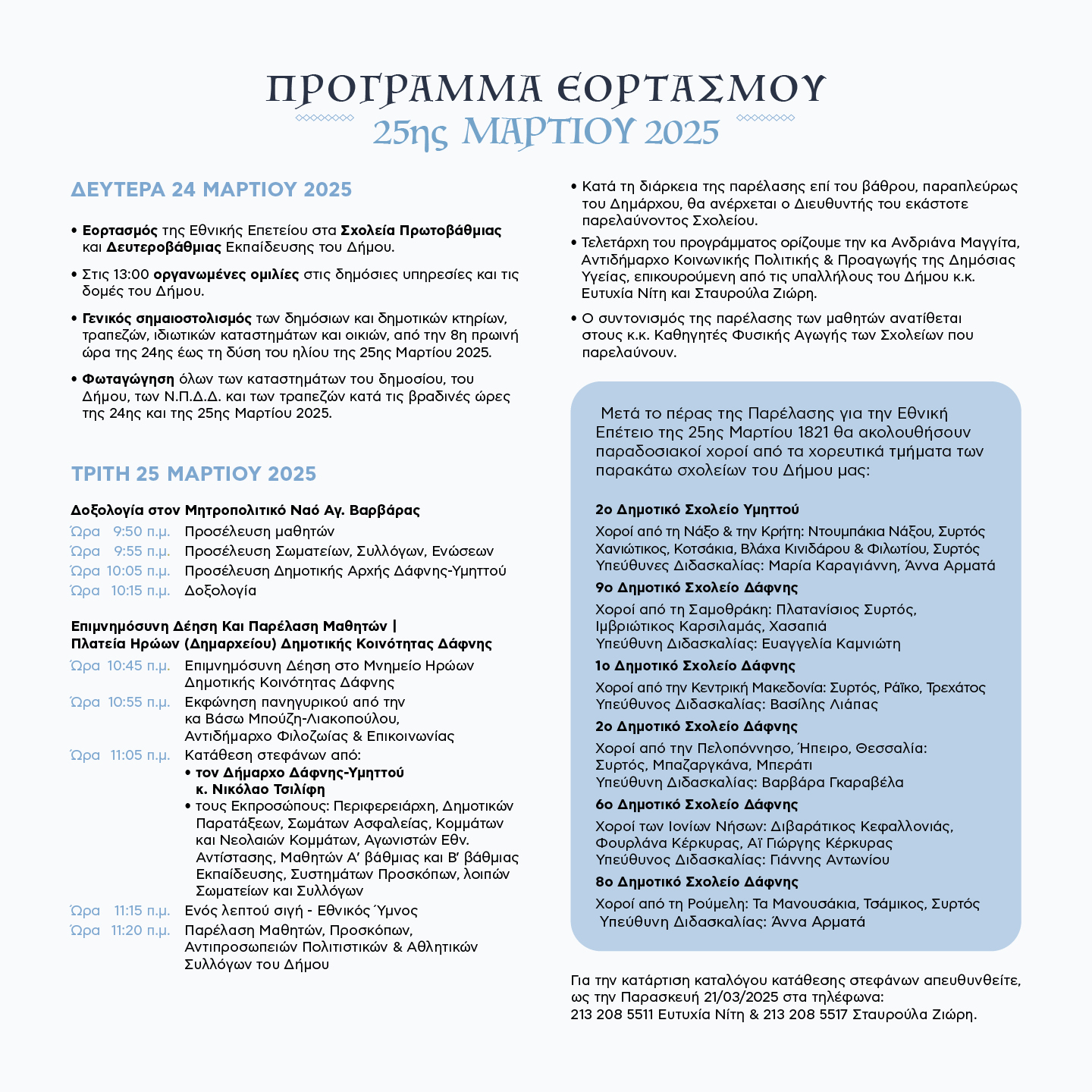• Γενικός σημαιοστολισμός των δημόσιων και δημοτικών κτηρίων, τραπεζών, ιδιωτικών καταστημάτων και οικιών, από την 8η πρωινή ώρα της 24ης έως τη δύση του ηλίου της 25ης Μαρτίου 2025.