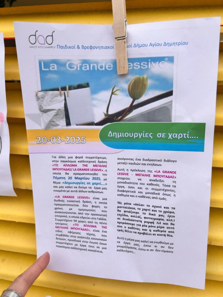 Μία μπουγάδα διαφορετική από τις άλλες, γεμάτη χρώμα και φαντασία, απλώθηκε στους Παιδικούς & Βρεφονηπιακούς Σταθμούς του Δήμου Αγίου Δημητρίου, που συμμετείχαν και φέτος στη διεθνή πολιτιστική δράσης «La Grande Lessive» (To Άπλωμα της Μεγάλης Μπουγάδας).