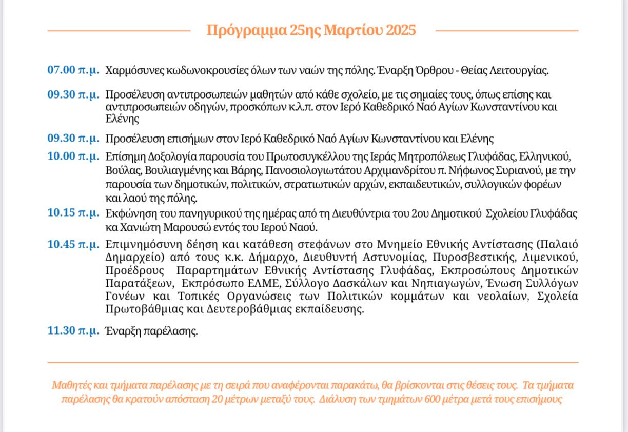 Τον πανηγυρικό της ημέρας θα εκφωνήσει η Διευθύντρια του 2ου Δημοτικού Σχολείου Γλυφάδας Μαρουσώ Χανιώτη, εντός του Ιερού Ναού.