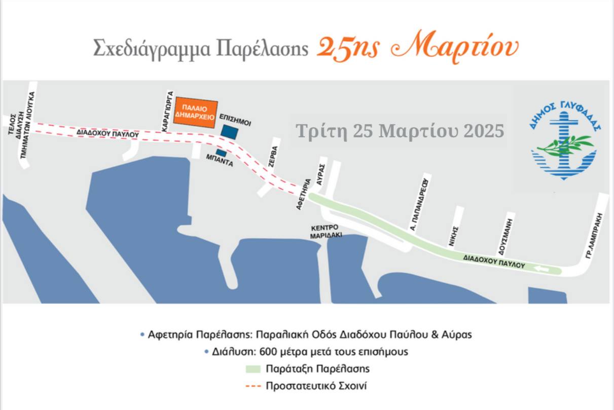 Με τη γαλανόλευκη «ντύθηκε» την Πέμπτη 20 Μαρτίου το Δημαρχείο Γλυφάδας, ενώ από την Κυριακή 23 Μαρτίου, στις 8:00 το πρωί μέχρι τη δύση του ηλίου της Τρίτης 25 Μαρτίου, θα υπάρχει γενικός σημαιοστολισμός στην πόλη.