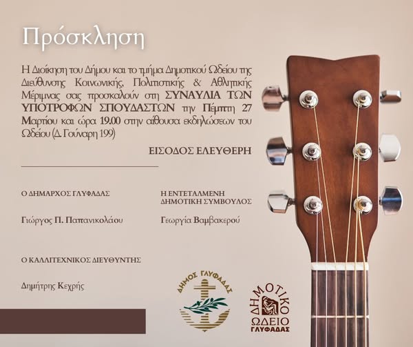 Άλλη μια μουσική βραδιά διοργανώνει ο Δήμος Γλυφάδας και το Δημοτικό Ωδείο της πόλης. Μια συναυλία των υποτρόφων σπουδαστών, με ποιοτική μουσική και ελεύθερη είσοδο.