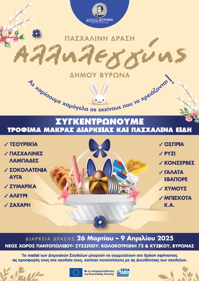 Ο Δήμος Βύρωνα οργανώνει δράση αλληλεγγύης για την ενίσχυση των οικογενειών που βρίσκονται σε ανάγκη εν όψει των εορτών του Πάσχα.