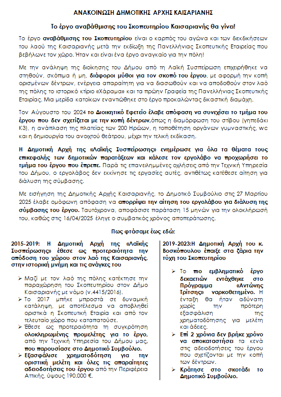 «ΑΝΑΚΟΙΝΩΣΗ ΔΗΜΟΤΙΚΗΣ ΑΡΧΗΣ ΚΑΙΣΑΡΙΑΝΗΣ