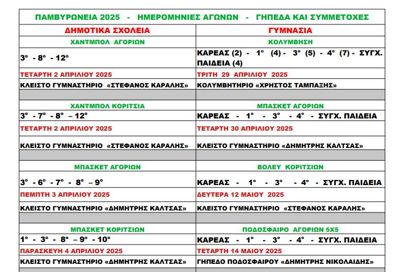 Δείτε παρακάτω τον αναλυτικό πίνακα με τα αθλήματα, τις συμμετοχές και το πρόγραμμα των αγώνων.