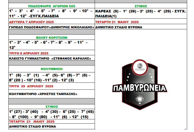 Έφτασε ο καιρός για τα «Παμβυρώνεια 2025», τον καθιερωμένο ετήσιο θεσμό του Δήμου Βύρωνα, όπου «μεγάλοι» πρωταγωνιστές είναι οι «μικροί» μαθητές των δημοτικών σχολείων και γυμνασίων της πόλης!