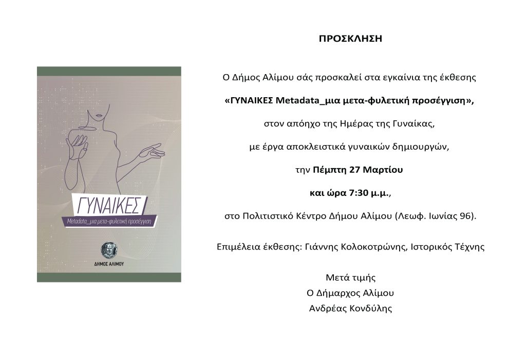 Την Πέμπτη 27 Μαρτίου 2025, στις 7.30 μ.μ., στο Πολιτιστικό Κέντρο του Δήμου Αλίμου θα πραγματοποιηθούν τα εγκαίνια της Εικαστικής Έκθεσης «ΓΥΝΑΙΚΕΣ Metadata_μια μετα-φυλετική προσέγγιση».