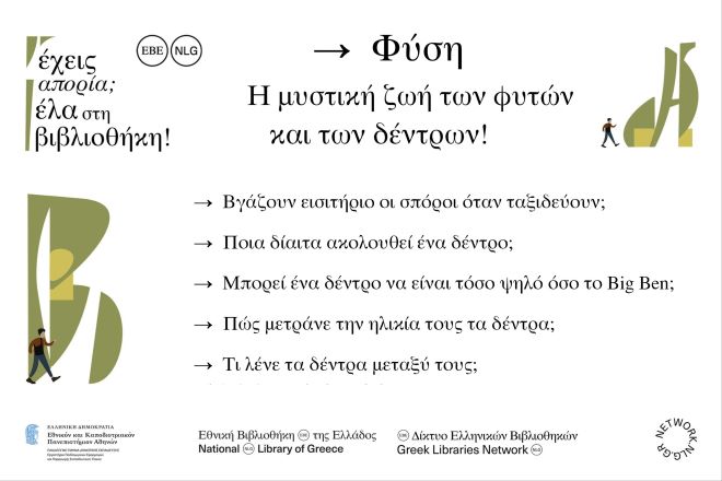 Η Δανειστική Συλλογή της Εθνικής Βιβλιοθήκης της Ελλάδος (ΕΒΕ) συμμετέχει στο πρόγραμμα του Δικτύου Ελληνικών Βιβλιοθηκών (ΔΕΒ) «Έχεις απορία; Έλα στη Βιβλιοθήκη!» και προσκαλεί τους μικρούς της φίλους να συμμετάσχουν στην τρίτη δράση: «Φύση: Η μυστική ζωή των φυτών και των δέντρων!»