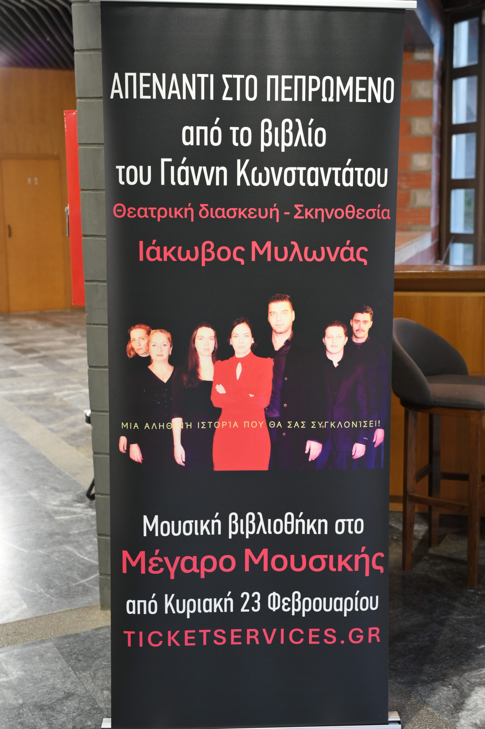 Μετά από έναν εντυπωσιακό κύκλο 16 συνεχόμενων παραστάσεων στο Μέγαρο Μουσικής, το καθηλωτικό θεατρικό έργο «Απέναντι στο πεπρωμένο», βασισμένο στο ομώνυμο βιβλίο του Δημάρχου Ελληνικού Αργυρούπολης Γιάννη Κωνσταντάτου, παρουσιάστηκε την Παρασκευή 11 και το Σάββατο 12 Απριλίου στο Πολιτιστικό – Συνεδριακό Κέντρο «Μίκης Θεοδωράκης», γνωρίζοντας θερμή αποδοχή και βαθιά συγκίνηση από το κοινό που το παρακολούθησε με μεγάλο ενδιαφέρον.